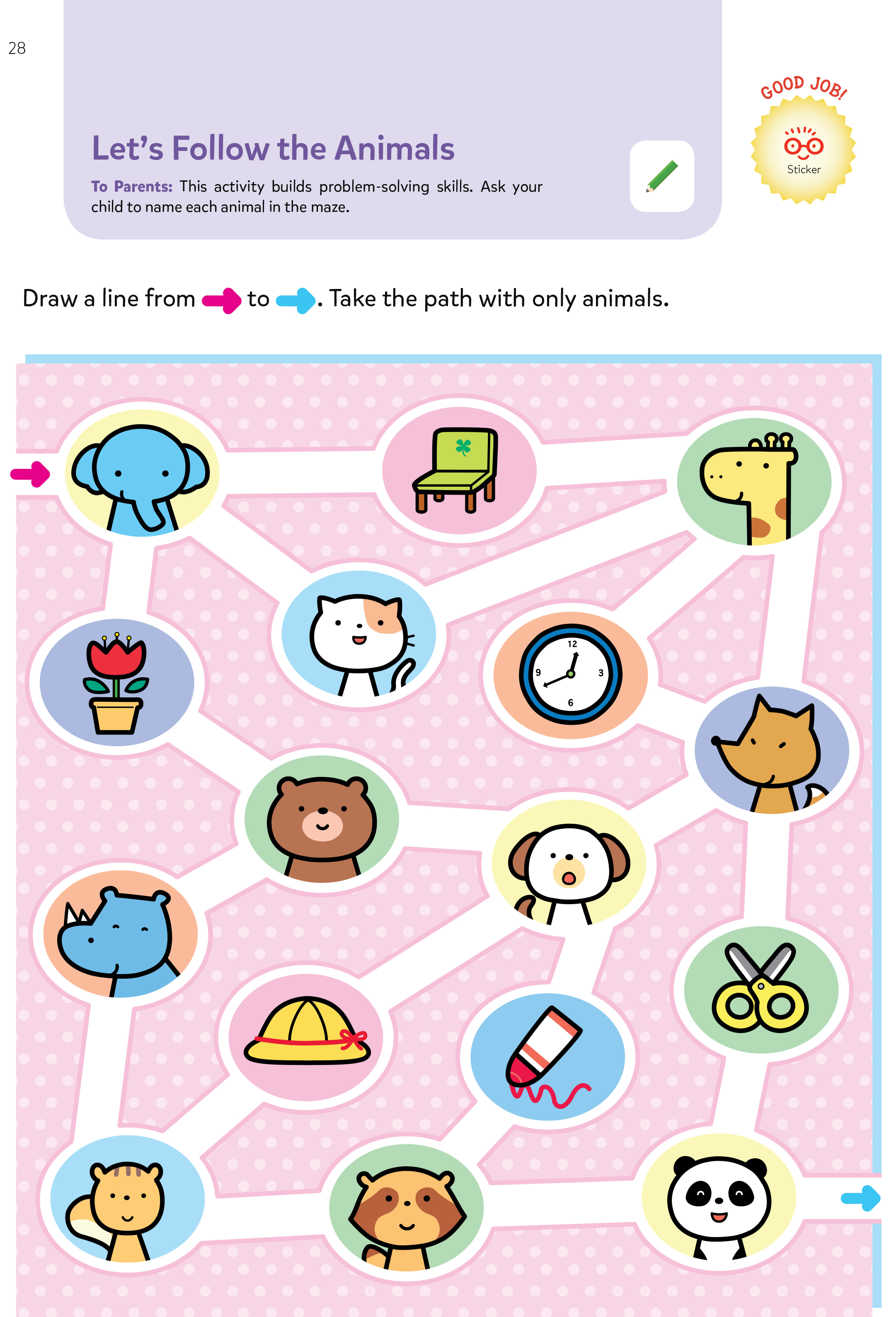 • Sách cung cấp các hoạt động vui nhộn, như mê cung, đếm số, ghép hình và thủ công giấy, giúp trẻ phát triển kỹ năng tư duy, suy luận, và sáng tạo. Các bài tập được thiết kế phù hợp với lứa tuổi, nhằm kích thích trẻ khám phá sự độc lập và khả năng quan sát. Sách còn bao gồm hơn 80 hình dán màu sắc và bảng trò chơi có thể xóa sạch, giúp trẻ giải trí và học tập.