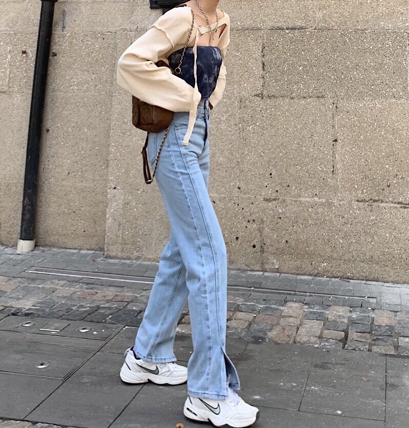 - Tên sản phẩm: Quần Jeans bò nữ cạp cao lưng cao ống rộng xẻ gấu Hàn Quốc