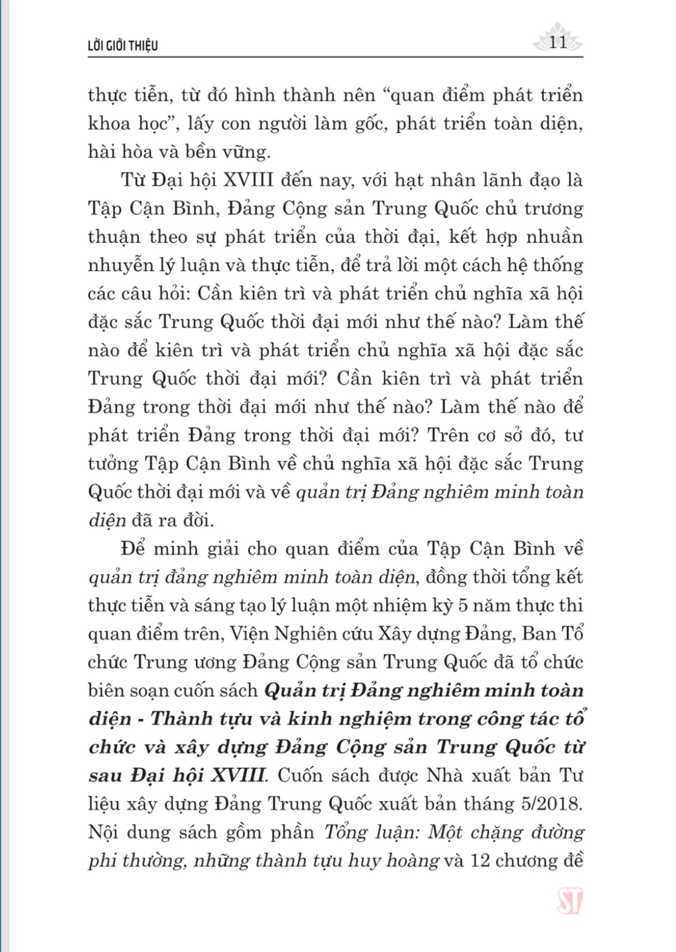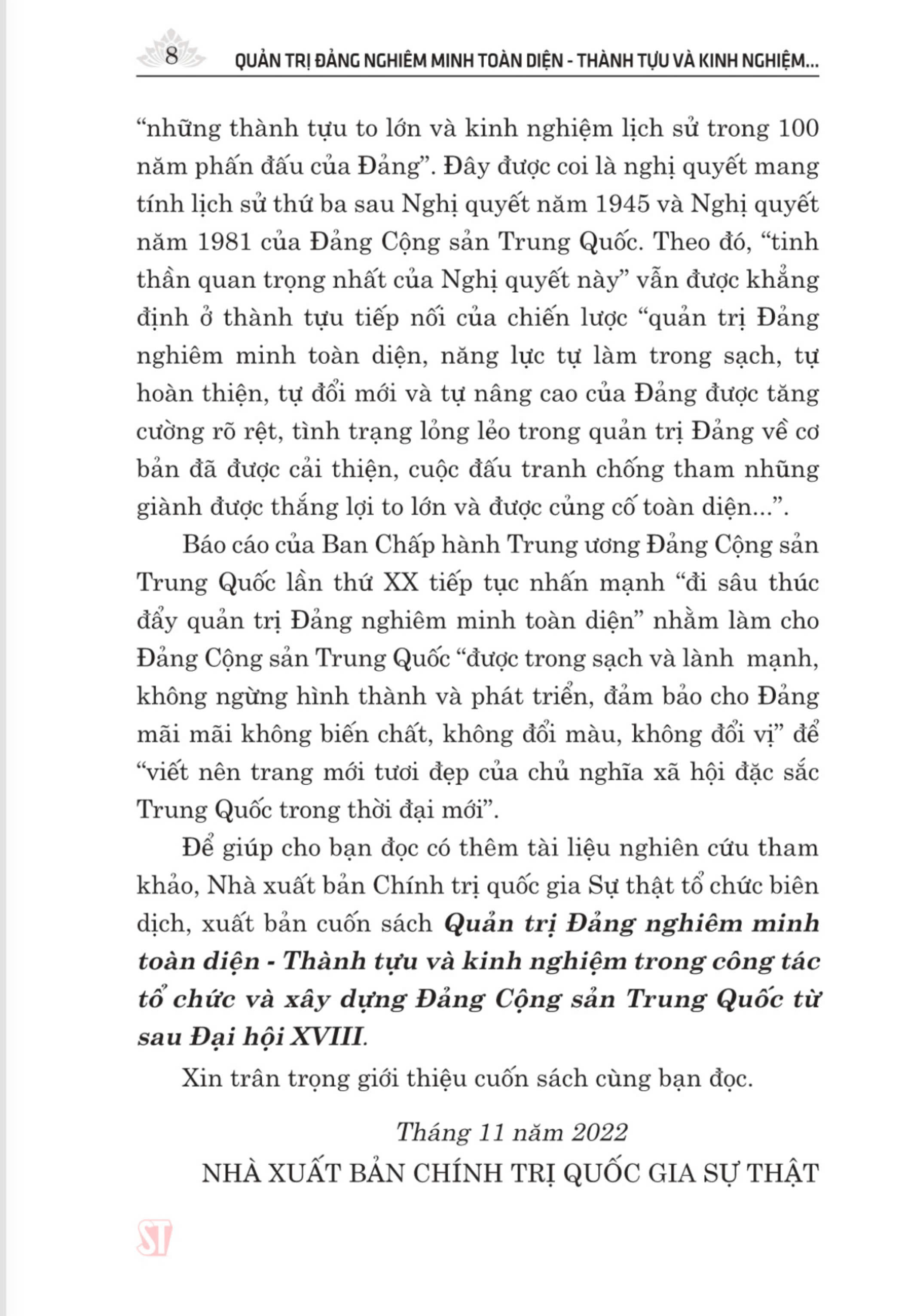 Mua tại TiktokVới kết cấu, bố cục rất lôgíc, những vấn đề căn cốt nhất của chiến lược quản trị Đảng nghiêm minh toàn diện của Đảng Cộng sản Trung Quốc đã được làm sáng rõ qua 12 chương sách, trong đó sự xác lập và hình thành chiến lược quản trị Đảng nghiêm minh toàn diện, xác định vai trò hạt nhân lãnh đạo của Tổng Bí thư Tập Cận Bình được làm rõ trong 2 chương đầu; trong khi những thành tựu cùng những bài học kinh nghiệm trong từng nội dung vấn đề của quản trị Đảng nghiêm minh toàn diện được phân tích, minh giải trong 10 chương còn lại. Ngoài ra, Tổng luận cũng là một nội dung rất cô đọng.