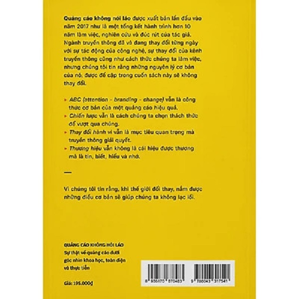 Dù là người mới bước vào ngành đang lạc lối giữa một rừng lý thuyết hay đã có nhiều kinh nghiệm chinh chiến lâu năm, “Quảng cáo không nói láo: sẽ dẫn dắt bạn khám phá thế giới quảng cáo dưới lăng kính khoa học thông qua 5 phần - 10 chương: quảng cáo, thương hiệu, chiến lược, ý tưởng, chuyện nghề.