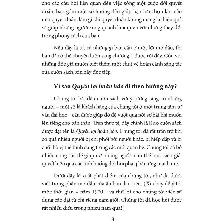 Và tất nhiên, chúng tôi không thể hoàn thành tất cả mọi thứ một mình. Hàng trăm, không, có lẽ là hàng nghìn đồng nghiệp trong ngành tâm lí học, cả nổi tiếng lẫn thầm lặng, cùng các chuyên gia trong lĩnh vực dịch vụ nhân sinh khác đã góp phần làm nên cuốn sách này, bằng những đánh giá chân thật, bằng sự động viên, khích lệ và quảng bá tới khách hàng. Tật mãn nguyện khi Quyền lợi hoàn hảo được đánh giá là một trong những cuốn sách xuất sắc nhất viết về sự quyết đoán nói riêng và một trong những cuốn sách tự trợ giá trị nhất nói chung. Chúng tôi mong rằng ấn bản lần thứ mười này sẽ tiếp tục là một nguồn tài nguyên có giá trị cho mọi người.