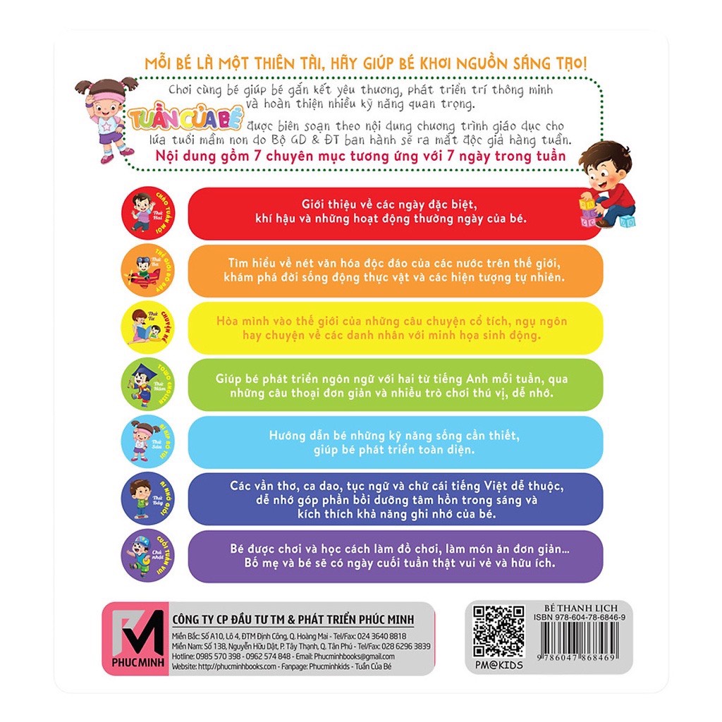 Combo gồm 4 cuốn Tuần của bé dành cho các bé sinh từ ngày 23/9 đến 22/10 thuộc cung Thiên Bình nhé! Đó là các cuốn: Bé thân thiện - Bé tinh tế - Bé công bằng - Bé thanh lịch; Bộ sách được biên soạn theo nội dung chương trình giáo dục dành cho lứa tuổi mầm non từ 3-6 tuổi. Nội dung mỗi cuốn được chia theo từng ngày trong tuần: 7 chuyên mục tương ứng với 7 ngày trong tuần, giúp trẻ không nhàm chán vì phụ huynh có thể tương tác cùng con các nội dung khác nhau mỗi ngày. Cụ thể nội dung mỗi ngày như sau: Thứ Hai - Chào tuần mới: Khám phá về thiên nhiên và các hoạt động của bé; Thứ Ba - Thế giới đó đây: Tìm hiểu về các nét văn hoá độc đáo của các nước trên thế giới; khám phá về động thực vật và các hiện tượng tự nhiên; Thứ Tư - Chuyện kể: Mỗi cuốn là 1 câu chuyện kể cho bé nghe; Thứ Năm- Towo English: Mỗi cuốn sẽ dạy cho bé làm quen 2 từ vựng tiếng Anh theo chủ đề qua câu thoại đơn giản, dễ nhớ; Thứ Sáu- Bí kíp bỏ túi: Những kĩ năng sống cần thiết cho trẻ; Thứ Bảy - Ai nhớ giỏi hơn: Các bài thơ, bài hát, câu đó dành cho bé; Chủ nhật - Cuối tuần vui: Các trò chơi cùng bé hoặc hướng dẫn bé làm đồ chơi; Khổ sách: 23x23 cm Sách có hình dán decal cho bé thoả trí sáng tạo. PHÚC MINH BOOKS CAM KẾT: - 100% sách do Phuc Minh Books phát hành, chính hãng, đầy đủ pháp lý gồm quyết định xuất bản, giấy phép phát hành.
