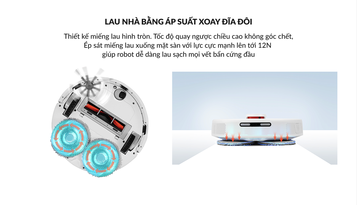 Tích hợp công nghệ Quét laser 3D định vị hệ thống hiển thị bản đồ toàn bộ ngôi nhà. Chốt quét: 2 chiếc Tự động quay về dock sạc, leo dốc 3cm. Thời gian sạc