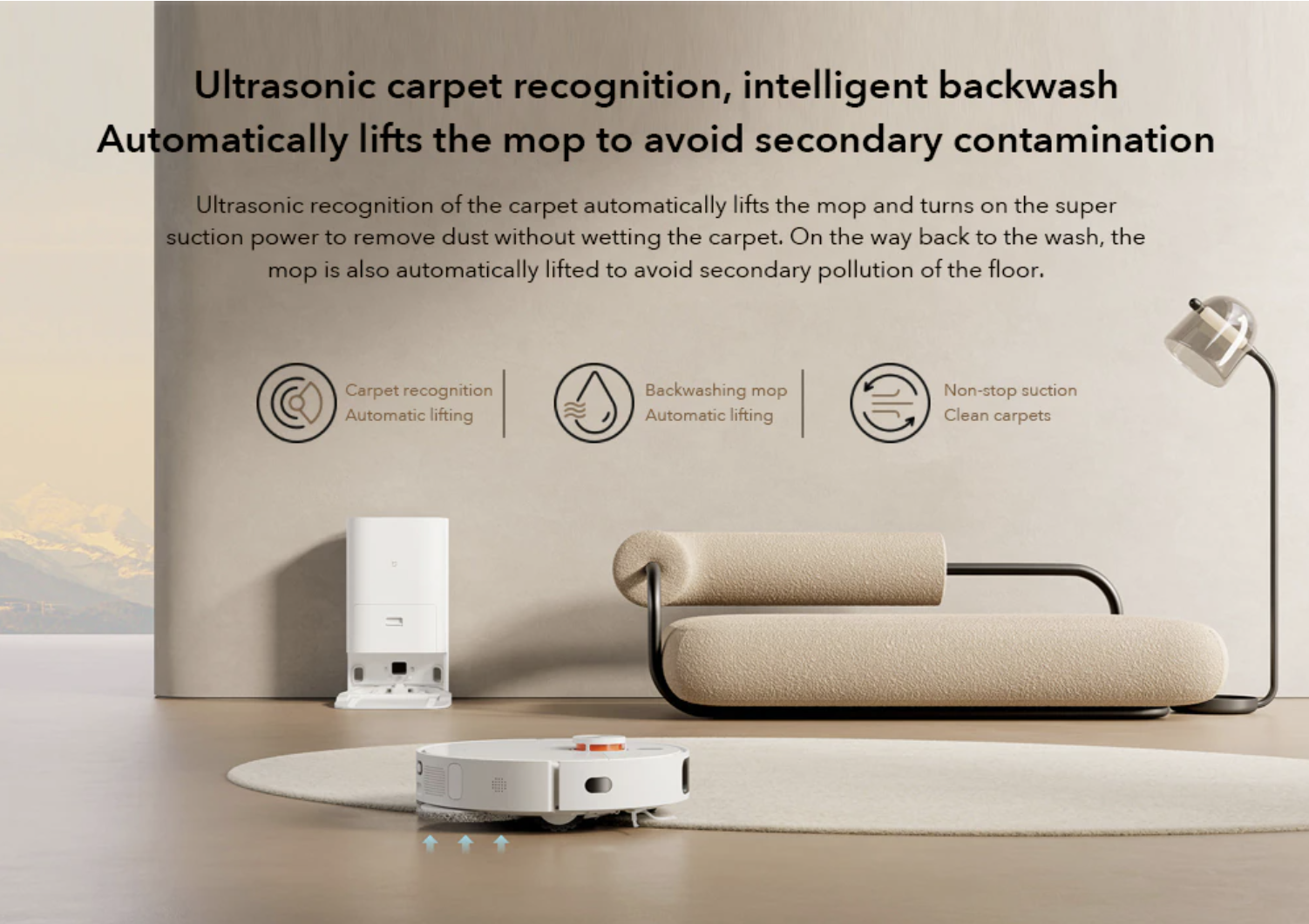 Được trang bị mô phỏng khả năng lau nhà bằng áp suất nhân tạo, mang lại hiệu quả làm sạch gấp 5 lần, có thể lau sạch vết cà phê khô, vết bùn khô và các vết bẩn khác trên mặt đất. Bên cạnh đó, quá trình vệ sinh cũng cực kỳ yên tĩnh, ít tiếng ồn, vì vậy người dùng sẽ có được không gian yên tĩnh khi robot hoạt động.