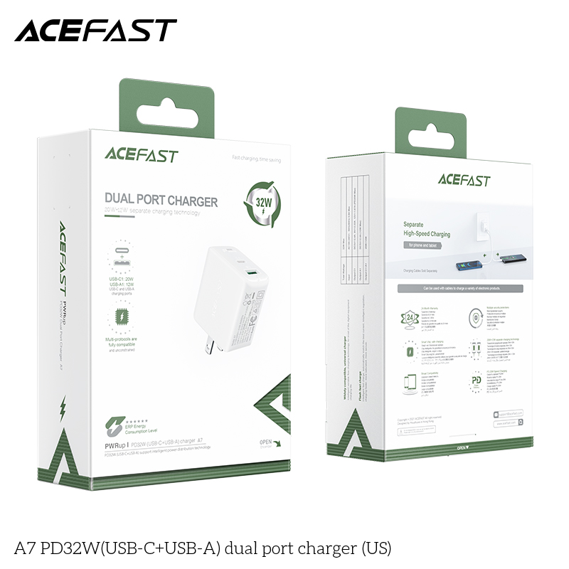 Sạc Acefast A7, 2 cổng USB-C PD3.0 20W và USB-A 12W, tổng công suất 32W phích cắm US, hỗ trợ hầu hết các giao thức sạc nhanh. Chất liệu PC chống cháy, chắc chắn và