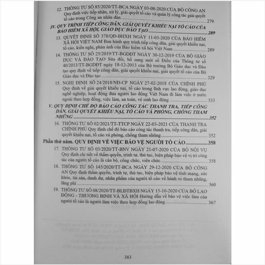 - Toàn bộ sách bìa mềm khổ lớn 20 x 28 cm phân phối bởi Nhà sách Nam Việt đều được bọc sách Plastic MIỄN PHÍ và xuất hóa đơn điện tử đầy đủ, nhanh chóng. …/… Lời giới thiệu: Khiếu nại, tố cáo là quyền, đồng thời là nghĩa vụ của công dân được ghi nhận tại Hiến pháp nước ta. Khiiếu nại, tố cáo và giải quyết khiiếu nại, tố cáo đúng pháp luật sẽ góp phần phát huy dân chủ, tăng cường pháp chế xã hội chủ nghĩa, bảo vệ lợi ích của Nhà nước, quyền, lợi ích hợp pháp của công dân, cơ quan, tổ chức. Hệ thống pháp luật của nước ta cũng ngày càng hoàn thiện. Nhằm phổ biến đến Quý Cơ quan, Đơn vị và Quý khách hàng thân thiết nắm bắt kịp thời những quy định mới nêu trên. Nhà sách Nam Việt xin trân trọng giới thiệu cuốn sách: 230 CÂU HỎI – ĐÁP VỀ KHIẾU NẠI, TỐ CÁO – QUY TRÌNH THANH TRA, TIẾP CÔNG DÂN, GIẢI QUYẾT KHIẾU NẠI, TỐ CÁO VÀ PHÒNG, CHỐNG THAM NHŨNG …/… Nội dung sách gồm 5 phần sau: Phần thứ nhất. Tình huống thường gặp về HỎI – ĐÁP LUẬT KHIẾU NẠI Phần thứ hai. Tình huống thường gặp về HỎI – ĐÁP LUẬT TỐ CÁO Phần thứ ba. Tình huống thường gặp về HỎI – ĐÁP LUẬT TIẾP CÔNG DÂN Phần thứ tư. QUY TRÌNH TIẾP CÔNG DÂN, GIẢI QUYẾT KHIẾU NẠI TỐ CÁO Phần thứ năm. QUY ĐỊNH MỚI VỀ VIỆC BẢO VỆ NGƯỜI TỐ CÁO Cảm ơn các bạn đã ghé thăm shop Nhà sách Nam Việt ! Sách 230 Câu Hỏi - Đáp Về Khiếu Nại, Tố Cáo - Quy Trình Thanh Tra, Tiếp Công Dân, Giải Quyết Khiếu Nại, Tố Cáo Và Phòng Chống Tham Nhũng Sách 230 Câu Hỏi - Đáp Về Khiếu Nại, Tố Cáo - Quy Trình Thanh Tra, Tiếp Công Dân, Giải Quyết Khiếu Nại, Tố Cáo Và Phòng Chống Tham Nhũng