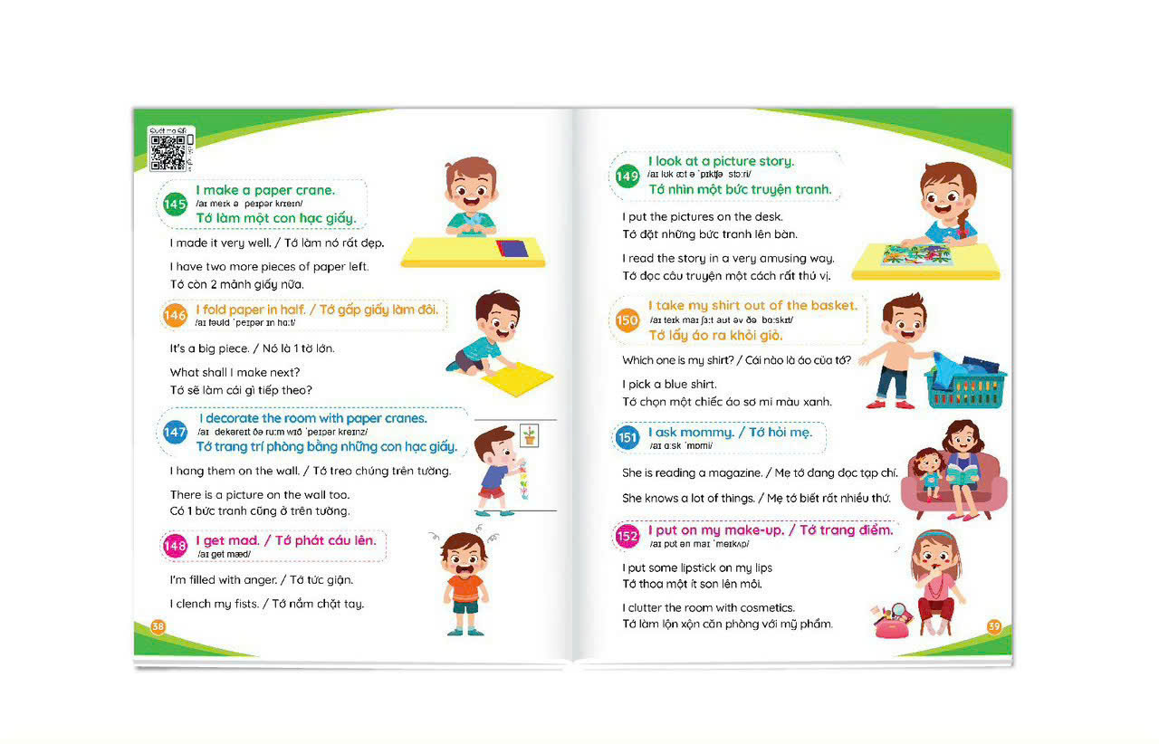 Mua tại TiktokSách 900 Câu Tiếng Anh Giao Tiếp Thường Dùng Hàng Ngày - Cẩm Nang Cho Mẹ Cùng Con Học Tiếng Anh Mỗi Ngày (Kèm File Nghe - Quét QR) GIỚI THIỆU SẢN PHẨM: Cuốn sách gồm 900 câu đàm thoại tiếng Anh để cha mẹ cùng con có thể giao tiếp về các chủ đề xung quanh cuộc sống hằng ngày, từ lúc thức dậy vào buổi sáng, đi học, đi chơi, đi siêu thị … cho đến lúc đi ngủ. Có cuốn sách này thì cha mẹ không lo bí từ, không biết nói tiếng Anh như thế nào cùng con. Đây là cuốn cẩm nang giúp cho cha mẹ có cơ hội học tập và giao tiếp tiếng Anh cùng con, để cả hai cùng tiến bộ mỗi ngày. Sách có kèm file nghe quét mã QR với giọng đọc tiếng Anh chuẩn để cha mẹ và con cùng nghe và tắm ngôn ngữ mỗi ngày. HƯỚNG DẪN BẢO QUẢN SÁCH THIẾU NHI: