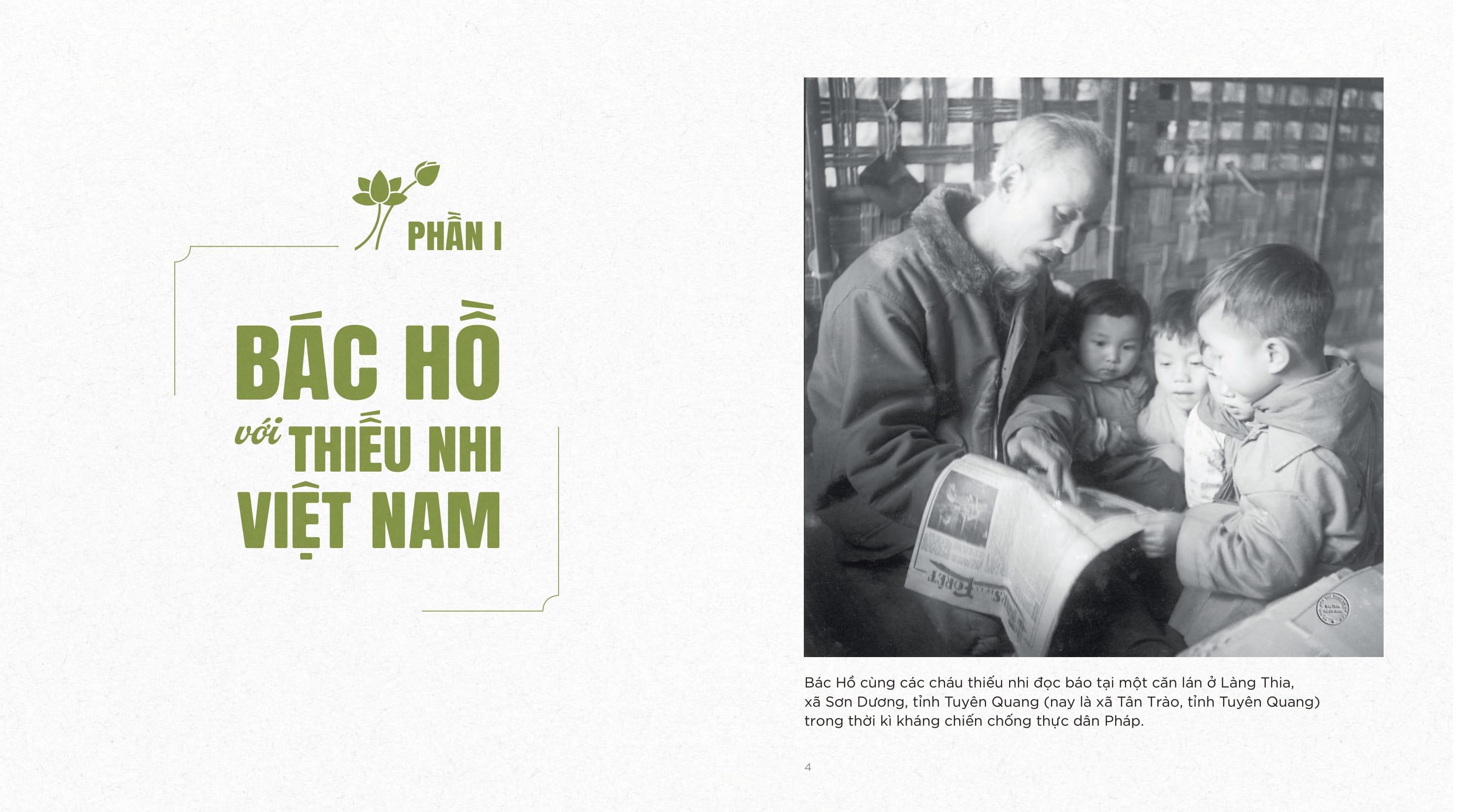 Tập ảnh Bác Hồ với thiếu nhi ghi lại những khoảnh khắc giản dị của Bác với các em nhỏ Việt Nam và thế giới. Mỗi bức ảnh đều cho thấy tình yêu thương và sự chăm lo ân cần của Bác Hồ dành cho các em, không chỉ bằng lời căn dặn, khuyên nhủ mà còn là những cử chỉ thân tình, ánh mắt trìu mến và nụ cười hiền hậu.