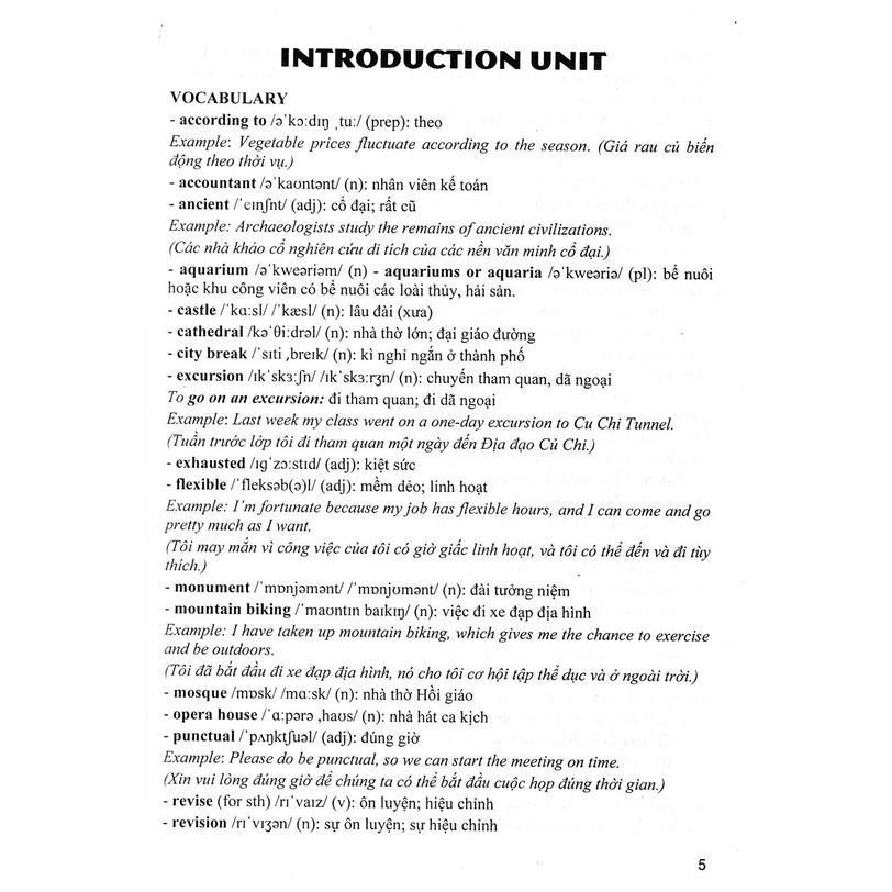 - Vocabulary: giải thích ý nghĩa những từ mới trong mỗi đơn vị bài học; kèm theo một số ví dụ minh họa cách dùng từ.