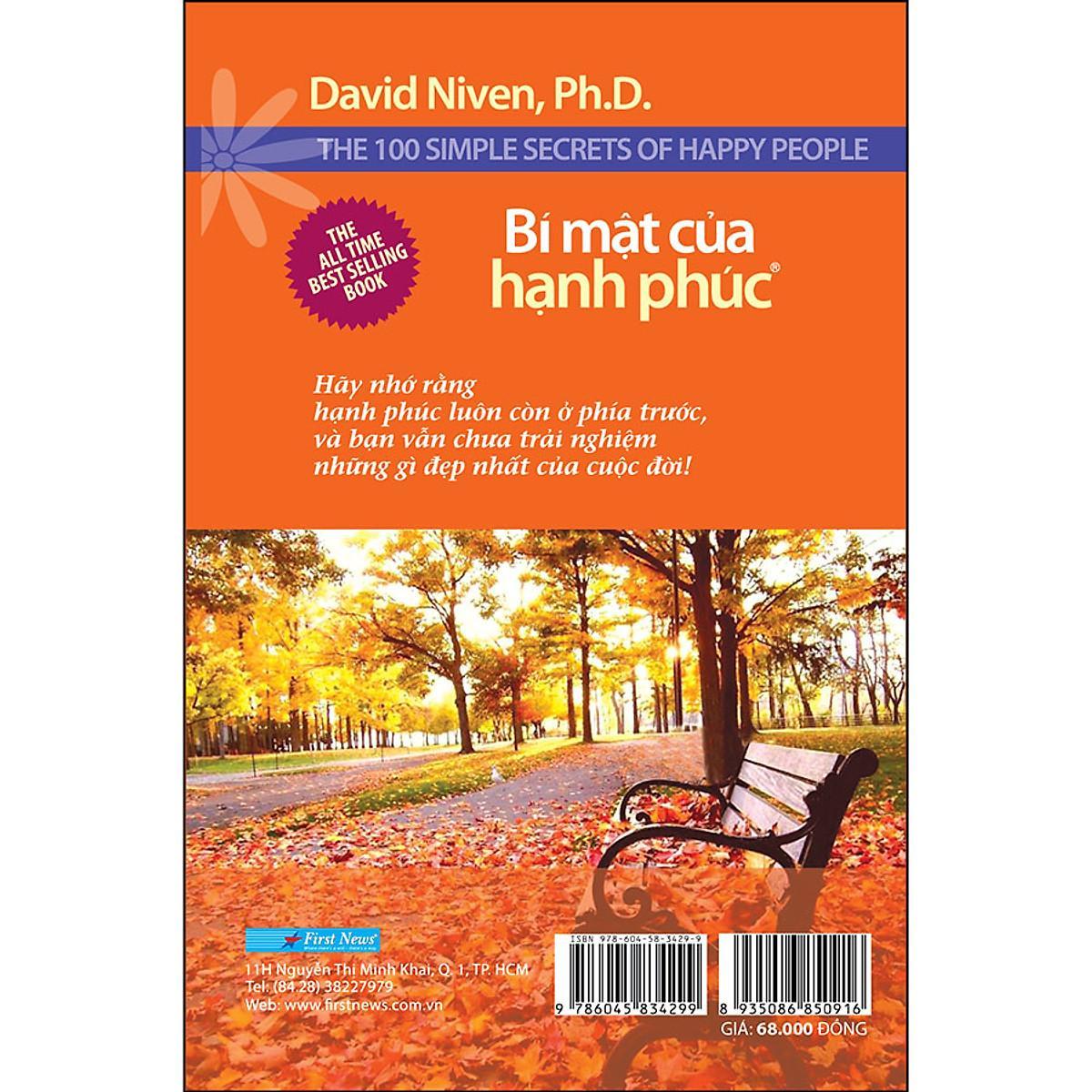 Bí Mật Của Hạnh Phúc (Khổ nhỏ) Để được hạnh phúc không chỉ là trăn trở của mọi người chúng ta hiện nay mà còn từng là những suy tư, câu hỏi của nhiều thế hệ. Có phải là hạnh phúc luôn ở phía trước và khó nắm bắt - chúng ta chỉ có thể hướng đến mà thôi. Hay hạnh phúc thật gần gũi, ở ngay trong tâm chúng ta. Rằng chỉ có những người từng trải qua khổ đau mới có thể hiểu giá trị và cảm nhận trọn vẹn giá trị của niềm vui hạnh phúc. Và ai đó đã chiêm nghiệm sâu sắc rằng hạnh phúc không phải là cảm giác tới đích, mà chính trên từng chặng đường đi, hạnh phúc không chỉ là nụ cười, mà còn là giọt nước mắt chia sẻ trên bờ vai tin cậy. Trong cuộc hành trình của cuộc sống, biết bao điều bất ngờ, biến cố buồn vui đón chờ ta. Và biết bao lần chúng ta phải đối diện với thất vọng, mất mát niềm tin, khổ đau và cả bất hạnh. Chúng ta nhận ra hạnh phúc không hề đơn giản. Và chúng ta đã từng trăn trở tìm cách để cảm nhận cuộc sống mình được hạnh phúc hơn. Bí Mật Của Hạnh Phúc thực sự là một cuốn sách mới mẻ và sâu sắc với những ý tưởng độc đáo có giá trị vĩnh hằng sẽ giúp bạn một cách nhìn, cách cảm nhận và tìm ra con đường đến Hạnh Phúc của chính mình. Cuốn sách sẽ cùng bạn chia sẻ những trải nghiệm chân thành, thực tế và hữu ích nhất cùng những câu chuyện sinh động để khám phá ra những khía cạnh của hạnh phúc. Những điều giản dị đó sẽ giúp chúng ta khám phá nội tâm, cách suy nghĩ, tư duy của chính mình, tìm ra được sự khác biệt giữa người hạnh phúc và không hạnh phúc để nghiệm ra hạnh phúc của mình.