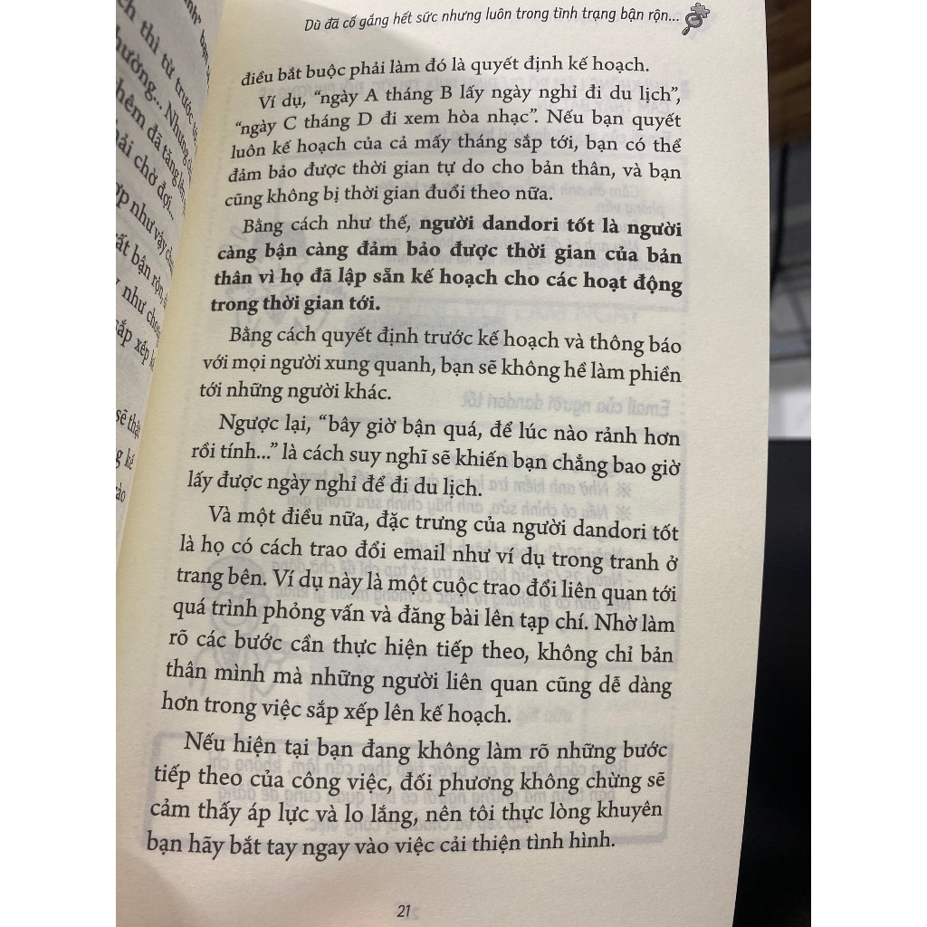 Ở Nhật, Dandori đã trở thành một từ phổ biến, người ta thường nghe “người này Dandori tốt” “người kia Dandori kém”. Vậy Dandori là gì? Có thể hiểu Dandori là năng lực chuẩn bị và sắp xếp công việc. Người có khả năng Dandori tốt không phải là người xử lý công việc nhanh, có thao tác khéo léo mà là người biết mục đích thực sự của việc mình sẽ làm và để đạt được mục đích đó phải lập kế hoạch chi tiết cũng theo nhiều phương án cụ thể, để dù có xảy ra bất cứ tình huống nào mục tiêu vẫn được thực hiện.