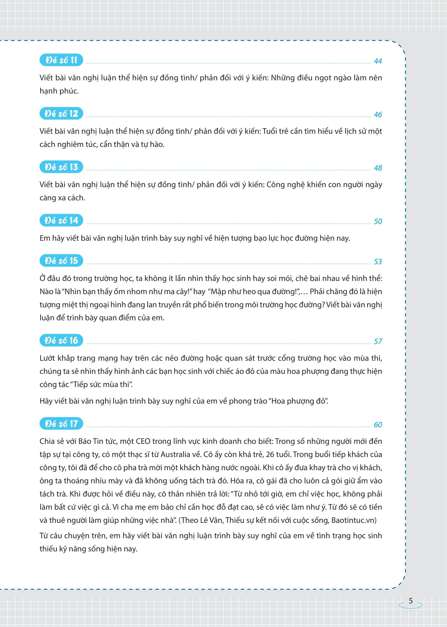- Bố cục khoa học, nâng cao tư duy theo lộ trình: Các bài văn được sắp xếp từ chủ đề cơ bản đến chuyên sâu, từ đơn giản đến phức tạp, giúp học sinh từng bước làm quen và nâng cao kỹ năng viết bài nghị luận xã hội một cách có hệ thống.
