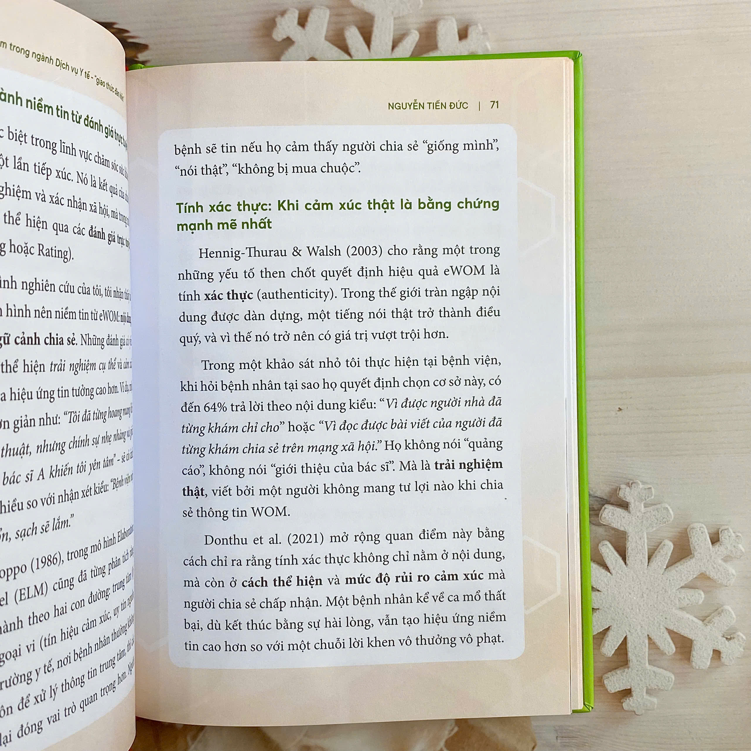 Là người có hơn 15 năm kinh nghiệm điều hành bệnh viện và xây dựng thương hiệu y tế, tác giả không chỉ viết từ góc nhìn lý thuyết mà còn từ những trải nghiệm thực tế đầy cảm xúc. Tác giả gọi cách mà người bệnh ảnh hưởng lẫn nhau trong quá trình ra quyết định là “giao thức đàn kiến”, giống như những chú kiến lần theo dấu vết của nhau để cùng tìm đường, người bệnh cũng tìm đến những nơi họ được nghe lời khen, được cảm nhận sự an tâm từ những câu chuyện thật.