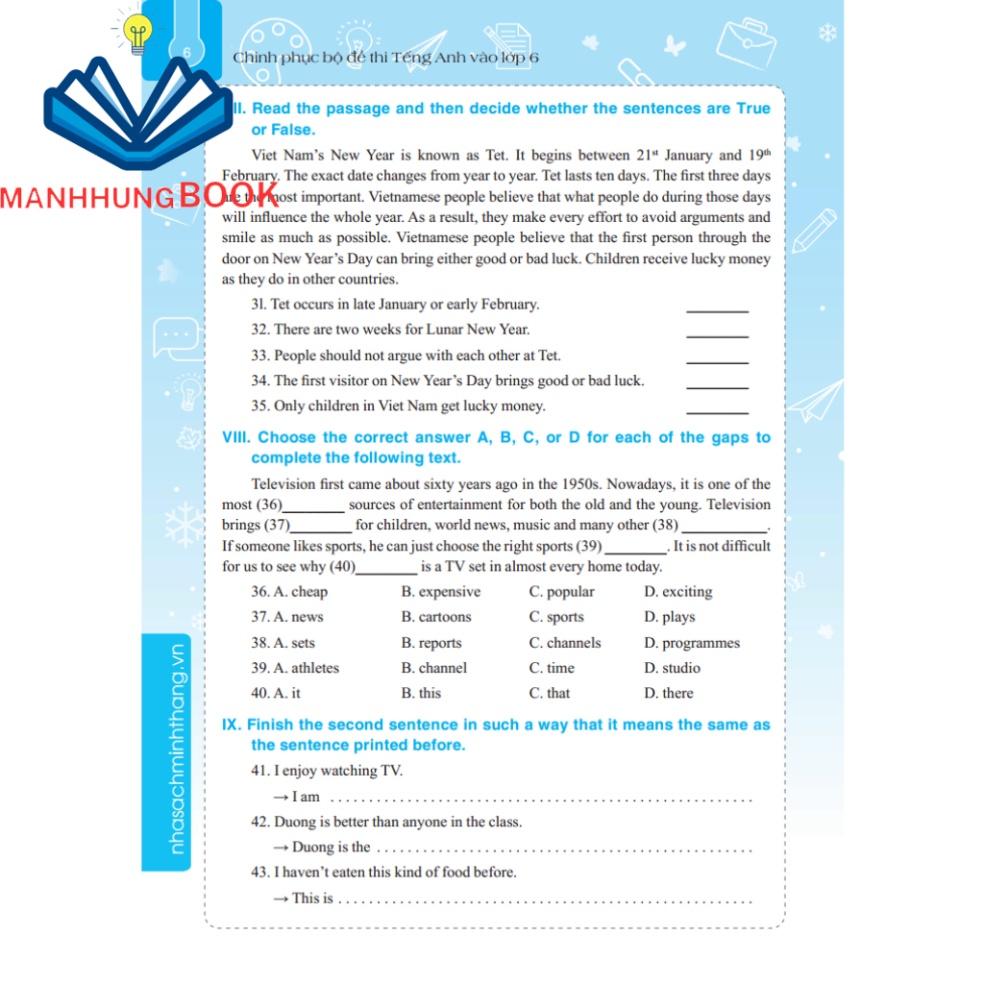 Cuốn “Chinh phục bộ đề thi Tiếng Anh vào lớp 6” lần này sẽ là cẩm nang giúp các em rút ngắn khoảng cách và những hạn chế trong hiểu biết của mình để đến với những đề thi vào lớp 6, thi vào các trường huyên, lớp Chọn sát với đề thi chính thức.