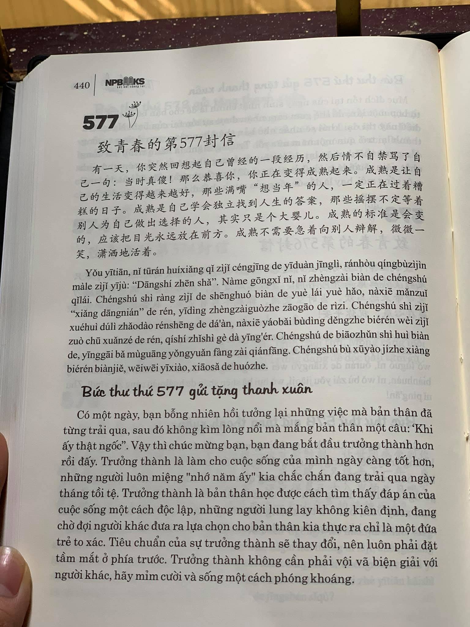 Nội dung sách:Gồm những bức thư song ngữ (Trung – Việt – Pinyin) gửi tặng thanh xuân tươi đẹp