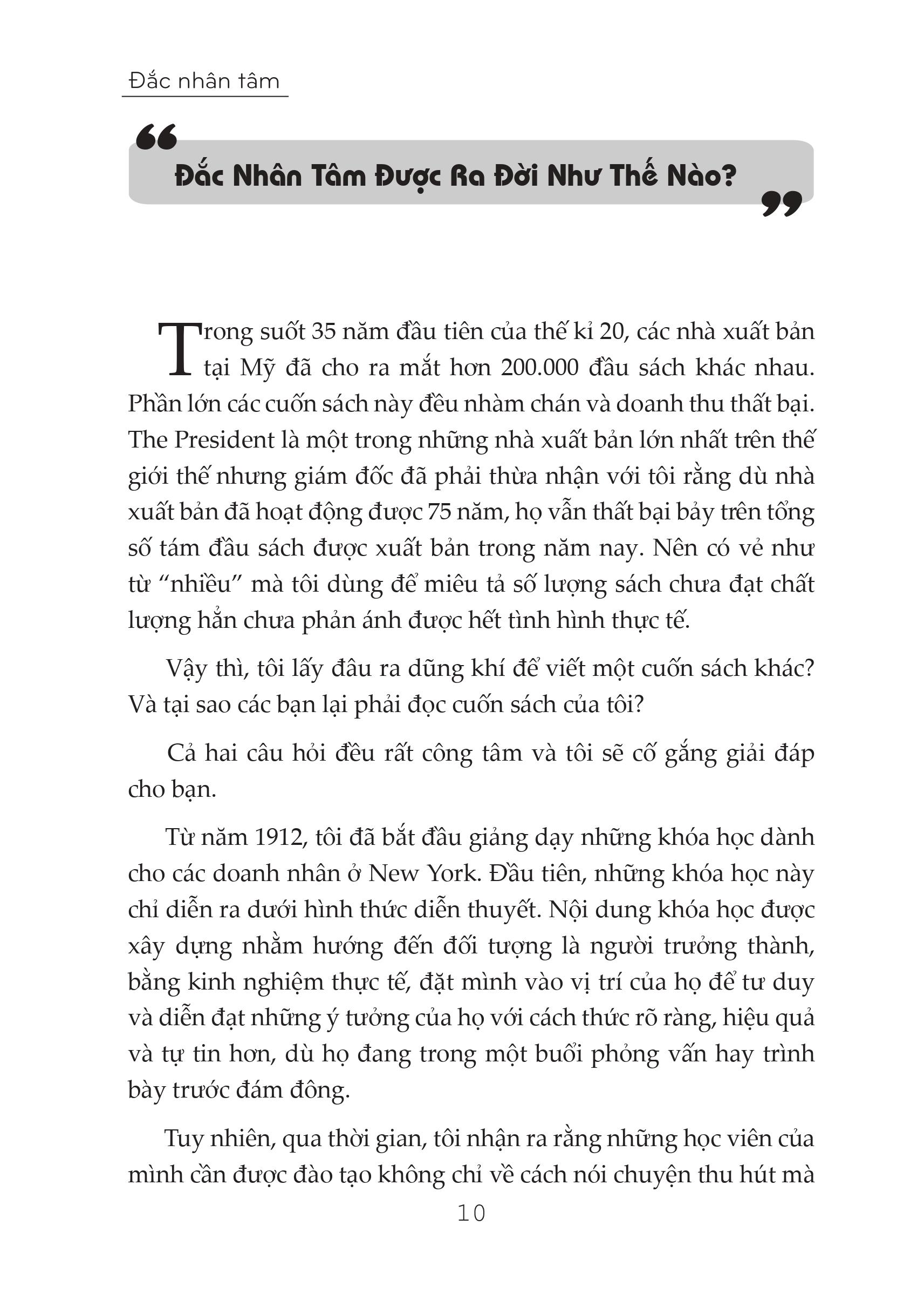 Mỗi trang sách đúc kết kinh nghiệm từ bậc thầy giao tiếp sẽ mở ra những góc nhìn thú vị về tâm lý - hành vi của con người dưới tác động của ngôn từ. Các nguyên tắc trong đây sẽ là chìa khoá giúp cho cuộc sống của bạn trở nên hạnh phúc, thành công hơn. Đây là quyển sách duy nhất về thể loại self-help liên tục đứng đầu danh mục sách bán chạy nhất (best-selling Books) do báo The New York Times bình chọn suốt 10 năm liền và đã được dịch ra hơn 50 ngôn ngữ khác nhau