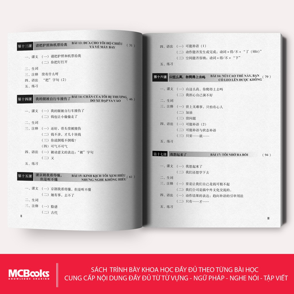 Các bài học trong “Giáo trình Hán ngữ 2 Tập 1 Quyển hạ phiên bản 3″ được Mcbooks thiết kế như sau: 1. Bài đọc, 2. Từ mới, 3. Chú thích, 4. Ngữ âm, Ngữ