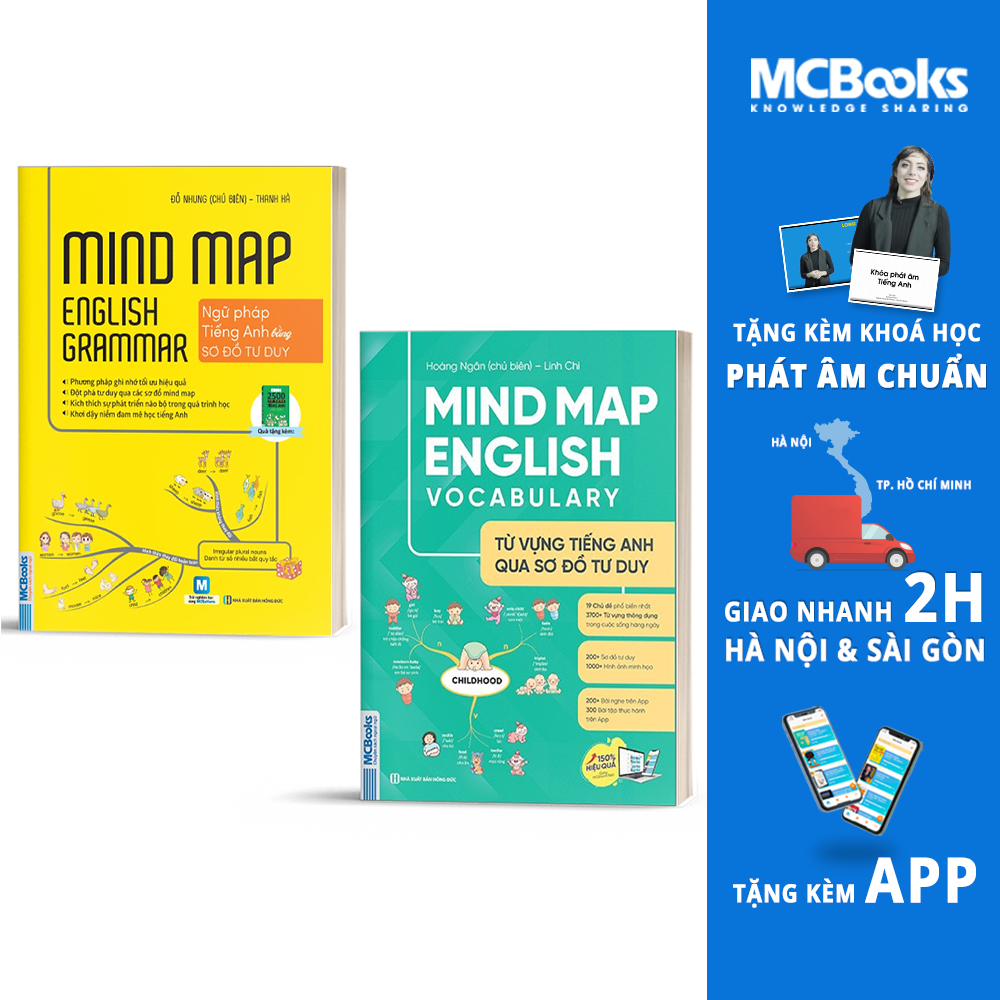 "Combo Mindmap English Grammar và Mindmap English Vocabulary" là combo tổng hợp những cấu trúc ngữ pháp căn bản nhất cùng từ vựng thông dụng được trình bày theo dạng sơ đồ tư duy sinh