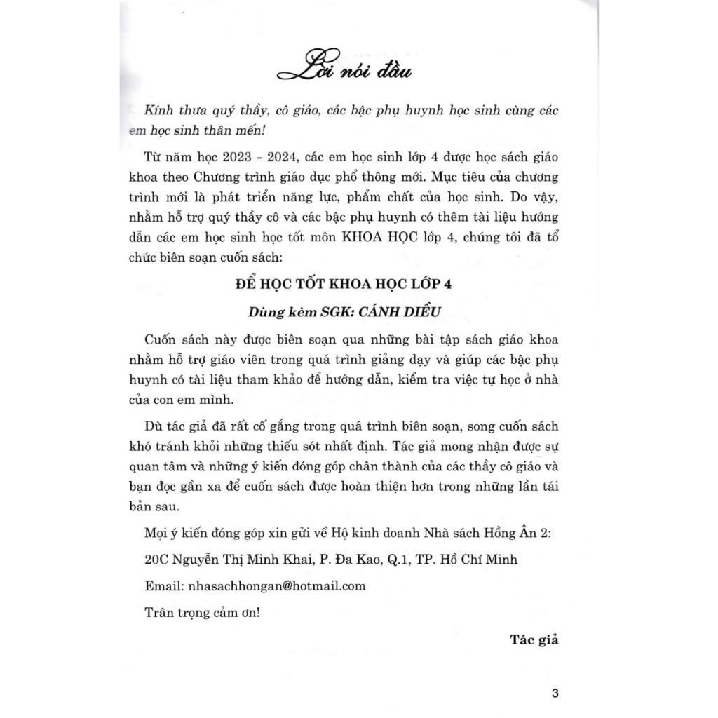 Từ năm học 2023 - 2024, các em học sinh lớp 4 được học sách giáo khoa theo Chương trình giáo dục phổ thông mới. Mục tiêu của chương trình mới là phát triển năng lực, phẩm chất của học sinh. Do vậy, nhằm hỗ trợ quý thầy cô và các bậc phụ huynh có thêm tài liệu hướng dẫn các em học sinh học tốt môn KHOA HỌC lớp 4, chúng tôi đã tổ chức biên soạn cuốn sách: