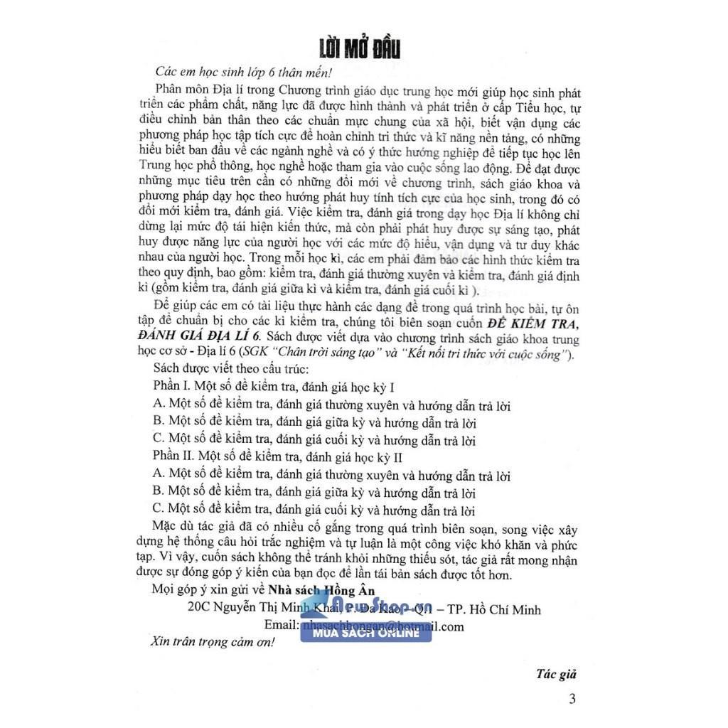 Để giúp các em có tài liệu thực hành các dạng đề trong quá trình học bài, tự ôn tập để chuẩn bị cho các kì kiểm tra, chúng tôi biên soạn cuốn Đề Kiểm Tra Đánh Giá Địa Lí Lớp 6 (Bám Sát SGK Chân Trời Sáng Tạo & Kết Nối Tri Thức Với Cuộc Sống). Sách được viết dựa vào chương trình sách giáo khoa trung học cơ sở - Địa lí 6 (SGK “Chân trời sáng tạo” và “Kết nối tri thức với cuộc sống”).