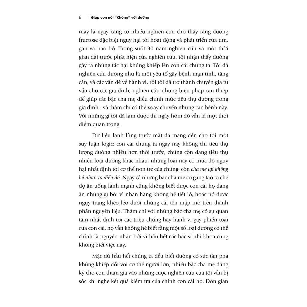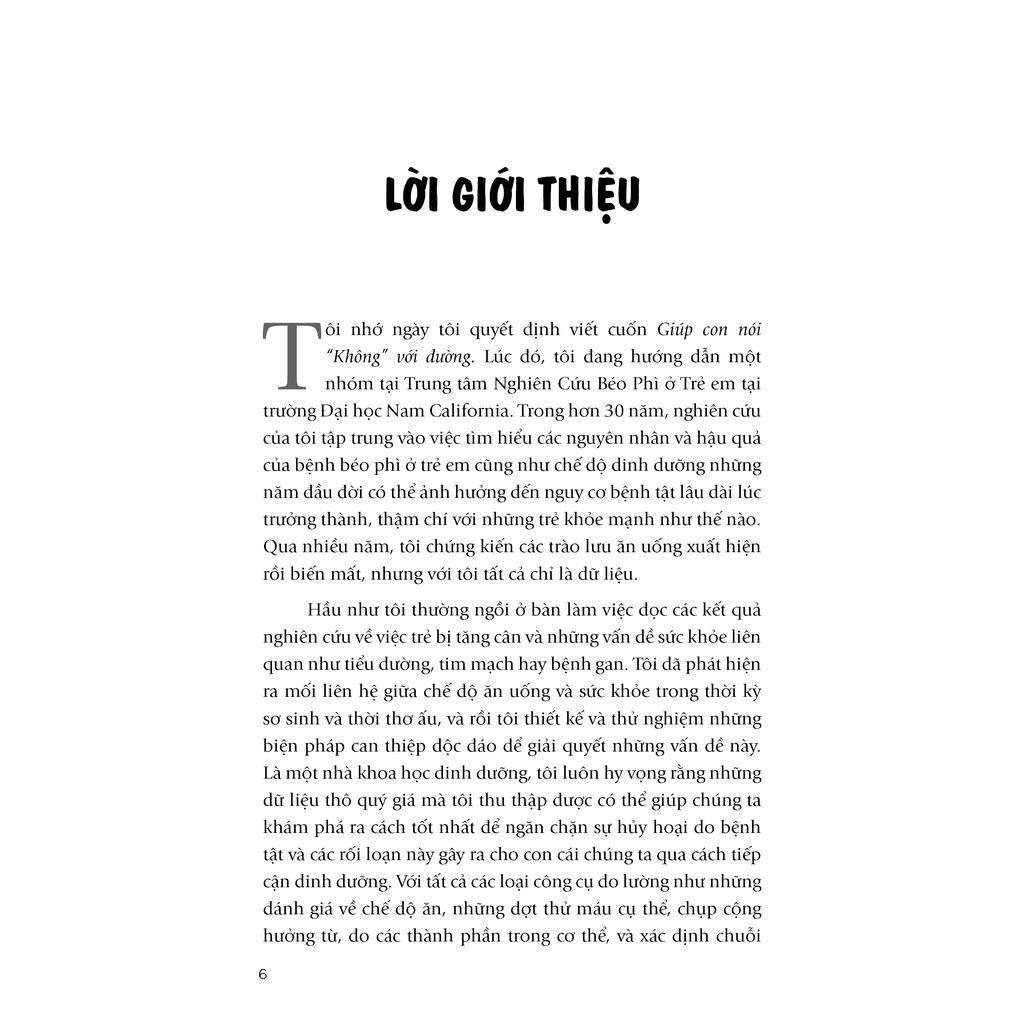 Tin tức khủng khiếp nhưng vẫn còn đó những hi vọng. Cuốn sách này chắc chắn sẽ mang đến cho các bậc phụ huynh những hướng dẫn cụ thể và những sự thật kinh ngạc về đường, tác động của đường đến với cơ thể và trí óc trẻ, nhưng đồng thời cũng sẽ chỉ ra những tiến bộ có thể thấy rõ rệt như trí nhớ được tăng cường, khả năng học tập và sức đề kháng khi chúng ta cắt giảm đường. Cuốn sách cung cấp cho độc giả những chiến lược để giảm đường, kế hoạch dần dần loại bỏ đường ra khỏi chế độ ăn thông qua Thử thách 7 Ngày và 28 Ngày, kèm theo những gợi ý về bữa ăn và cách để mọi người trong gia đình cùng tham gia vào chiến dịch “chống đường” ngọt ngào này, mang đến một khởi đầu mới cho thế hệ tương lai.