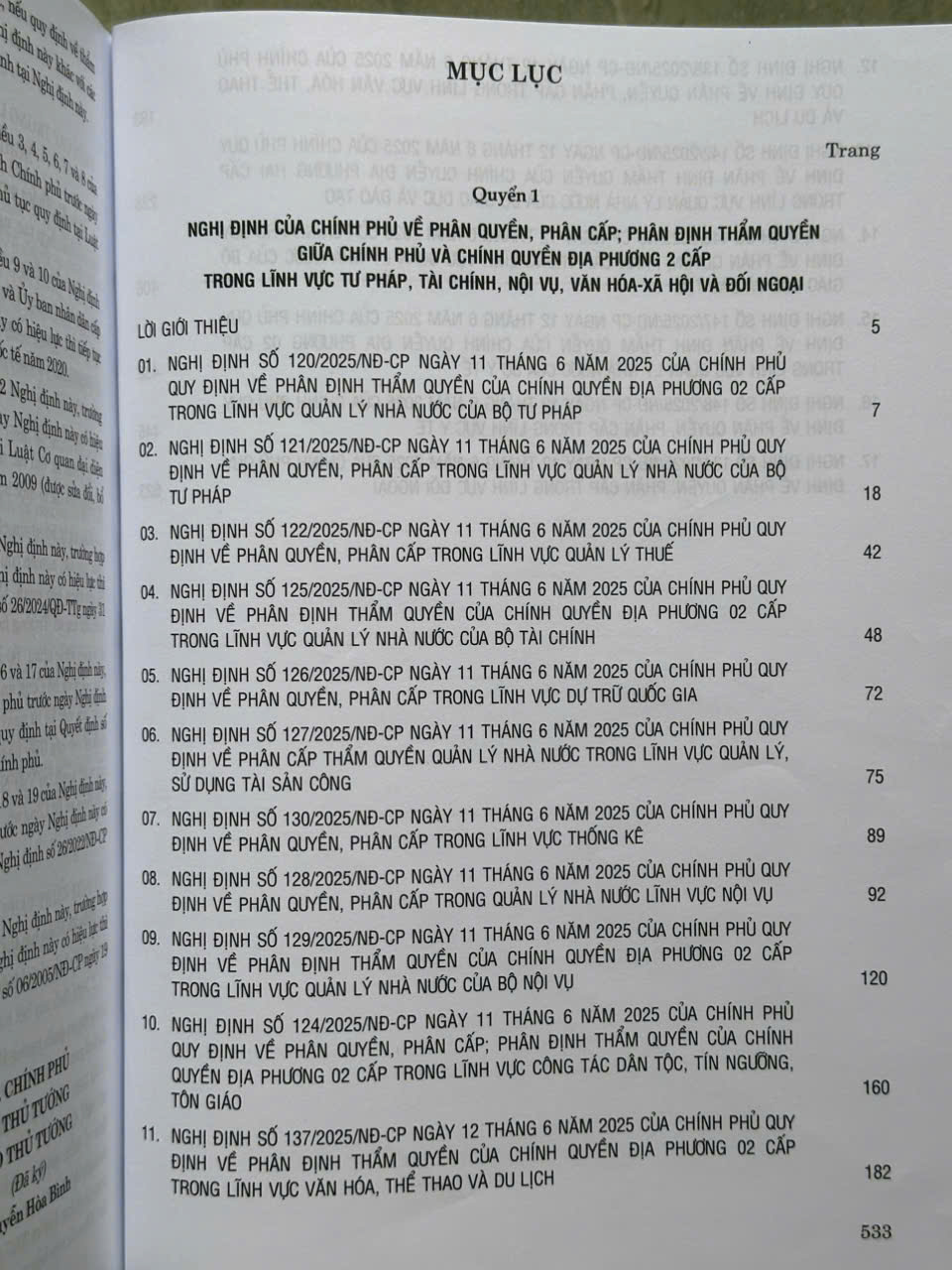 Quyển 1: Các Nghị định về phân quyền, phân cấp; phân định thẩm quyền giữa chính phủ và chính quyền địa phương 2 cấp trong lĩnh vực tư pháp, tài chính, nội vụ, văn hóa – xã hội và đối ngoại (sách phát hành tháng 8/2025, dày 536 trang, giá bìa: 395.000 đồng/cuốn)