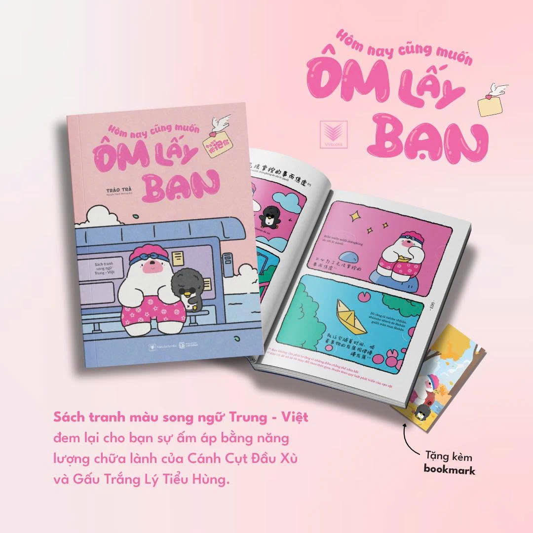 Không dừng lại ở một cuốn sách tranh đơn thuần, “Hôm nay cũng muốn ôm lấy bạn” còn là dạng sách tranh song ngữ Trung – Việt, vừa mang đến niềm vui qua những mẩu chuyện thường ngày vừa có thể đọc và biết thêm ngoại ngữ mới. Không cố rao giảng những lý thuyết cứng nhắc, cuốn sách song ngữ này còn tinh tế kèm theo phiên âm và dịch nghĩa vô cùng chi tiết sẽ từ từ gieo vào bạn vốn tiếng Trung thông qua những câu chuyện thường nhật xoay quanh cuộc sống hằng ngày. Thông qua những bức tranh đơn giản nhưng cũng đầy suy ngẫm của gấu trắng và cánh cụt hy vọng bạn sẽ cảm nhận được sự yêu thương và chữa lành.