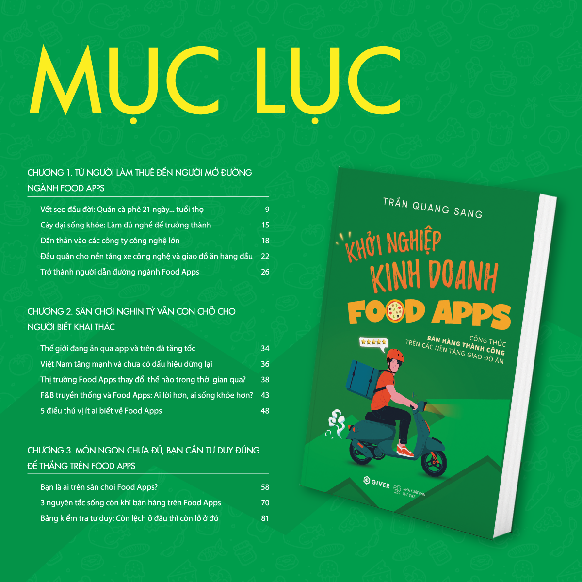Sách - Khởi Nghiệp Kinh Doanh Food Apps - Công Thức Bán Hàng Thành Công Trên Các Nền Tảng Giao Đồ Ăn   Công thức thực chiến giúp x3 doanh thu trên các nền tảng giao đồ ăn (Food Apps) - giúp bạn kiểm soát chi phí, nâng cao giá trị đơn hàng, thúc đẩy tỷ lệ chuyển đổi, mở rộng mô hình kinh doanh… và phát triển bền vững.   Đây là quyển sách đầu tiên tại Việt Nam viết về kinh doanh trên các nền tảng giao đồ ăn như G.r.a.b Food, S.h.o.p.e.e Food... Với 8 chương sách, cuốn sách sẽ mang lại cho bạn: Tư duy đúng để khởi nghiệp trên Food Apps. Cách chọn sản phẩm dễ bán, dễ lời, dễ vận hành dựa trên hành vi người dùng và đặc thù nền tảng. Cách tối ưu gian hàng từ A đến Z: thiết kế menu, định giá món, xử lý đơn hàng, chạy khuyến mãi và đánh giá sao. Công thức x3 doanh thu, giữ vị trí top mà không phụ thuộc khuyến mãi. Cách tăng trải nghiệm khách hàng ở từng điểm chạm như hình ảnh, đóng gói, tốc độ giao, thái độ tài xế… Lộ trình nhân bản mô hình từ quán nhỏ đến chuỗi nhượng quyền. Với giọng văn gần gũi và hóm hỉnh, tác giả sẽ tháo gỡ từng vấn đề của người bán và đưa ra các giải pháp thực tế nhất. VỀ TÁC GIẢ TRẦN QUANG SANG - Chuyên gia Food Apps 12 năm kinh nghiệm trong bán lẻ: F&B, thời trang & ICT Founder & CEO Công ty DIGIFNB Từng phụ trách khu vực Miền Trung & Tây Nguyên cho nền tảng giao đồ ăn hàng đầu Việt Nam với gần 35.000 gian hàng, giúp doanh số Đà Nẵng tăng gấp 7 lần trong vài tháng Tư vấn chiến lược & vận hành Food Apps cho các thương hiệu: Thai Market, R.a.u.M.aM.i.x, Pi Thái, Ulangon, Ba Hưng Bakery, Bánh mì Dòn Dòn, Chạm Đà Lạt… Một trong những người đầu tiên tại Việt Nam xây dựng khóa học chuyên sâu về Food Apps và cam kết hiệu quả cho học viên. Mentor và diễn giả được mời chia sẻ tại nhiều chương trình đào tạo dành cho nhà bán F&B.   TÓM TẮT SÁCH Cuốn sách gồm 8 chương, dẫn dắt người đọc từ tư duy nền tảng đến các kỹ năng thực chiến, giúp bất kỳ ai, kể cả người từng thất bại, có thể khởi nghiệp thành công và làm giàu trên các nền tảng giao đồ ăn như G.r.a.b Food, S.h.o.p.e.e Food…  Chương 1. Từ Người Làm Thuê Đến Người Mở Đường Ngành Food Apps Từng “chạy thị trường” rất thành công cho các hãng công nghệ lớn, tác giả chuyển sang G.r.a.b đúng lúc thị trường bị bỏ ngỏ. Chỉ trong vài tháng, anh mở rộng thị trường khu vực miền Trung lên gấp 5 - 7 lần. Sau đó, anh khởi nghiệp ngành Food Apps với sứ mệnh giúp các chuỗi lớn và quán nhỏ chinh phục “miếng bánh” béo bở này. Chương 2. Sân Chơi Nghìn Tỷ Vẫn Còn Chỗ Cho Người Biết Khai Thác Tác giả phân tích vì sao thị trường Food Apps đang là cơ hội cực lớn cho người khởi nghiệp ít vốn, chỉ rõ ưu và nhược điểm của các mô hình “Food delivery” để bạn có thể chọn được con đường phù hợp nhất với mình. Chương 3. Món Ngon Chưa Đủ, Bạn Cần Tư Duy Đúng Để Thắng Trên Food Apps Phần này giúp bạn gỡ bỏ loạt lầm tưởng chết người, rằng Food Apps chỉ là công cụ phụ, rằng cứ đăng món là có đơn, rằng chạy khuyến mãi càng nhiều càng tốt. Bạn sẽ hiểu vai trò của từng bên trong hệ sinh thái (khách hàng, tài xế, nền tảng, cửa hàng) và lý do vì sao phải làm đúng ngay từ đầu. Chương 4. Chọn Món Không Khéo Bán Lỗ Cả Đời Chương này cung cấp công thức chọn sản phẩm 4 + 4 + 3, trong đó mô hình Ikigai kết hợp thêm các tiêu chí dành riêng cho sản phẩm kinh doanh trên Food Apps cũng như loại trừ 3 điều tối kỵ khi chọn món. Tác giả cũng phân tích ưu nhược các món điển hình, gợi ý các món chỉ yêu cầu số vốn từ 5 triệu và trả lời các câu hỏi phổ biến liên quan đến chủ đề chương này. Chương 5. Tối Ưu Gian Hàng Từ A đến Z Thiết lập một gian hàng Food Apps giống như bày biện mặt tiền một quán ăn thật sự, từ hình ảnh, tên món, mô tả, định giá, thứ tự sắp xếp đến khuyến mãi và quy trình xử lý đơn. Bạn sẽ học cách tối ưu gian hàng theo các nguyên tắc chuẩn chỉnh. Chương 6. Công Thức X3 Doanh Thu Mà Không Cần Đốt Tiền Đúc kết từ trải nghiệm thực tế của hàng ngàn quán, tác giả chia sẻ công thức giúp tăng doanh thu gấp 3 lần bằng nhiều cách như kiểm soát chi phí, nâng cao giá trị đơn hàng, thúc đẩy tỷ lệ chuyển đổi, tận dụng vị trí hiển thị và khuyến mãi thông minh. Bạn cũng sẽ hiểu rõ cách kiểm soát thu chi để biết cách bán có lời thật sự. Chương 7. Thắng Lớn Nhờ Những Điểm Chạm Nhỏ Xíu Khác với bán tại chỗ, khách hàng online không thấy mặt bạn nên mọi trải nghiệm đều đến từ ảnh món, hộp đựng, tốc độ giao, thái độ tài xế... đều phải được chăm chút. Chương này giúp bạn nâng điểm cảm xúc, giữ chân khách cũ và tăng đơn tự nhiên. Chương 8. Hôm Nay Một Quán, Ngày Mai 10 Điểm Bán Từ một gian hàng nhỏ, bạn hoàn toàn có thể phát triển thành chuỗi mini hoặc mô hình nhượng quyền nếu hiểu cách xây dựng hệ thống. Tác giả chỉ r