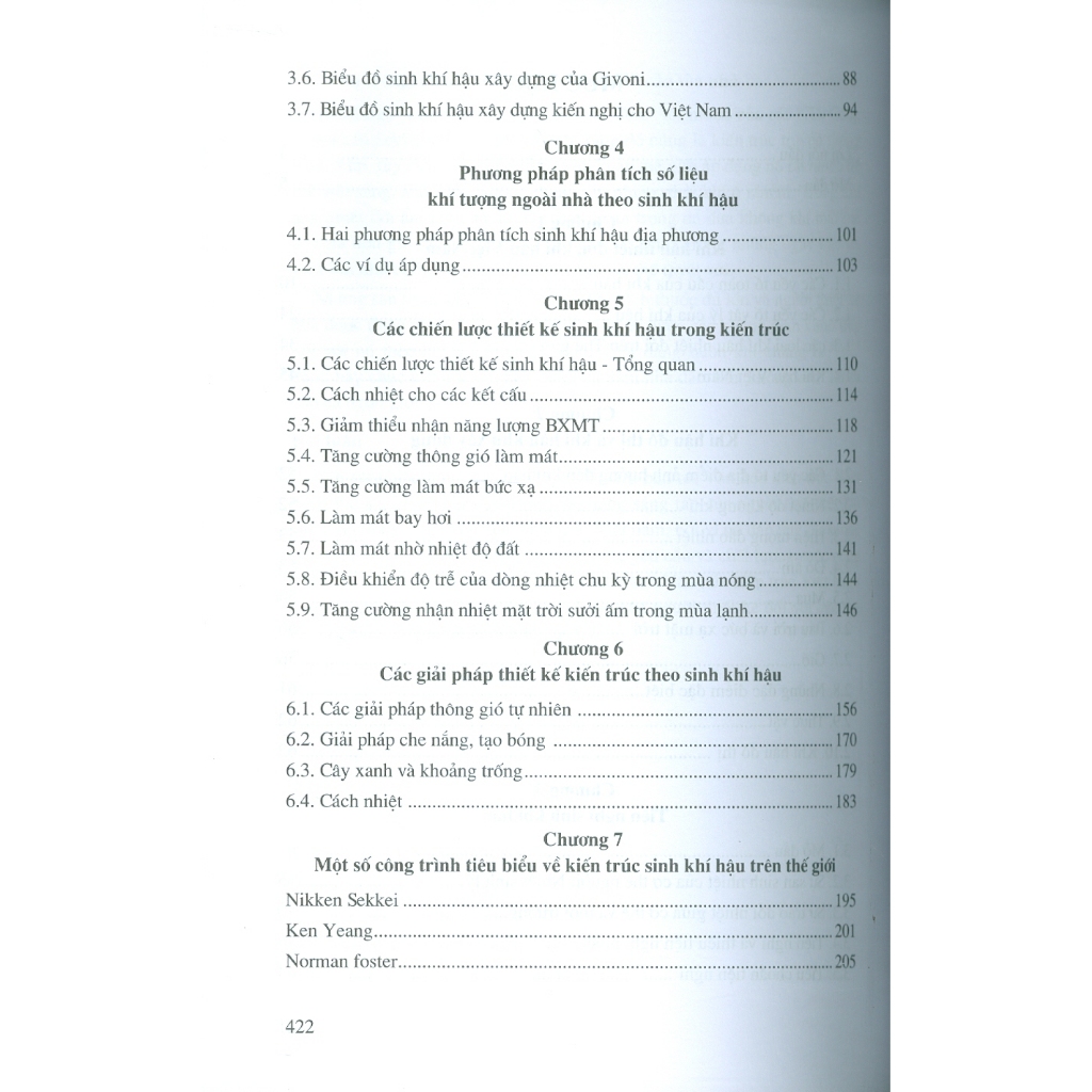- Từ đó đề xuất các Chiến lược và Giải pháp thiết kế kiến trúc sinh khí hậu trong điều kiện khí hậu Việt Nam để tạo được môi trường tiện nghi trong nhà (Chương 5 & 6). Chương 7 giới thiệu một vài công trình nổi tiếng trên thế giới.