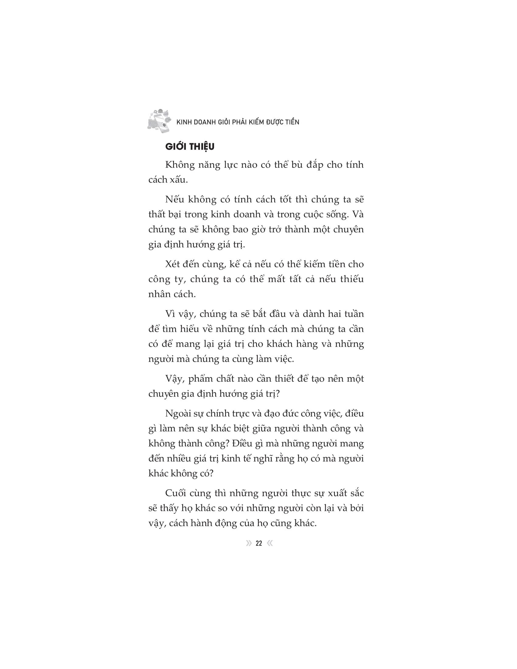 “Kinh doanh giỏi phải kiếm được tiền” – cuốn sách chứa đựng những bài học giá trị để phát triển sự nghiệp cá nhân và xây dựng một doanh nghiệp phát triển bền vững. Cuốn sách này tập trung vào 9 lĩnh vực mà những nhà lãnh đạo hay những người làm kinh doanh cần mài giũa và thông thạo, bao gồm: