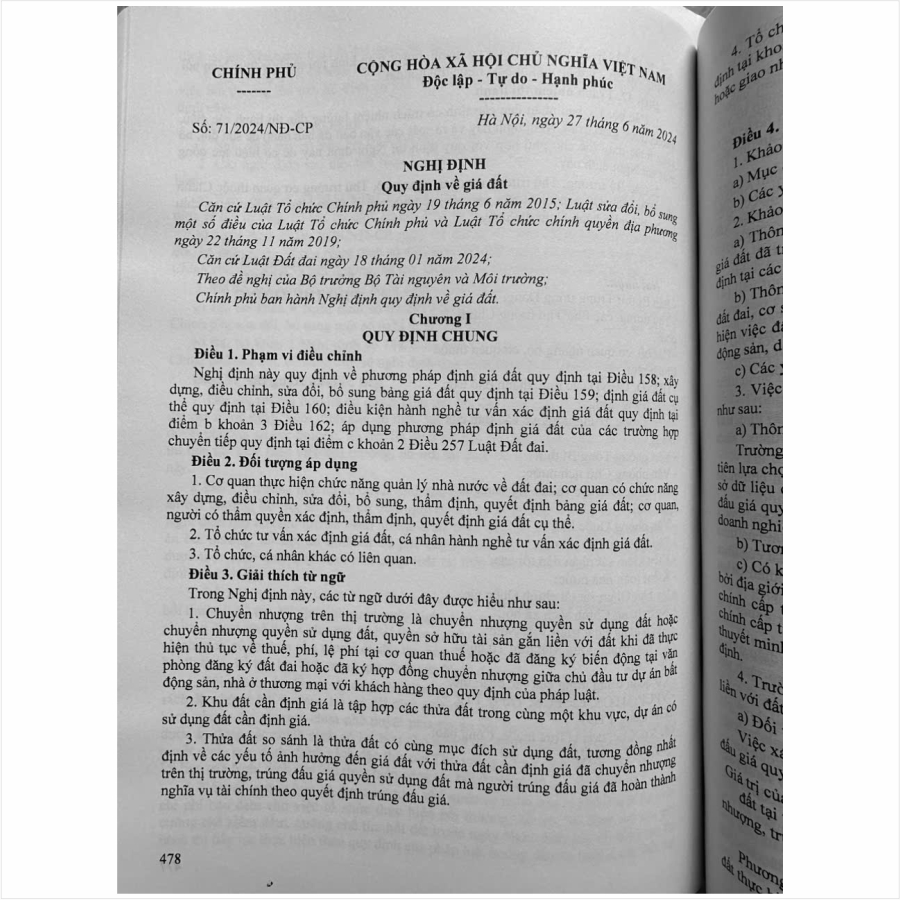 Ngày 18 tháng 01 năm 2024, Quốc hội nước Cộng hòa xã hội chủ nghĩa Việt Nam khóa XV, kỳ họp bất thường lần thứ năm đã chính thức thông qua Luật Đất đai số 31/2024/QH15 (sau đây gọi tắt là Luật Đất đai 2024) với nhiều điểm mới nhằm thể chế hóa toàn diện các chủ trương, chính sách của Đảng và Nhà nước. Nhằm sớm đưa Luật đất đai 2024 Chính phủ và các Bộ ngành đã ban hành nhiều văn bản quy định chi tiết thi hành như.