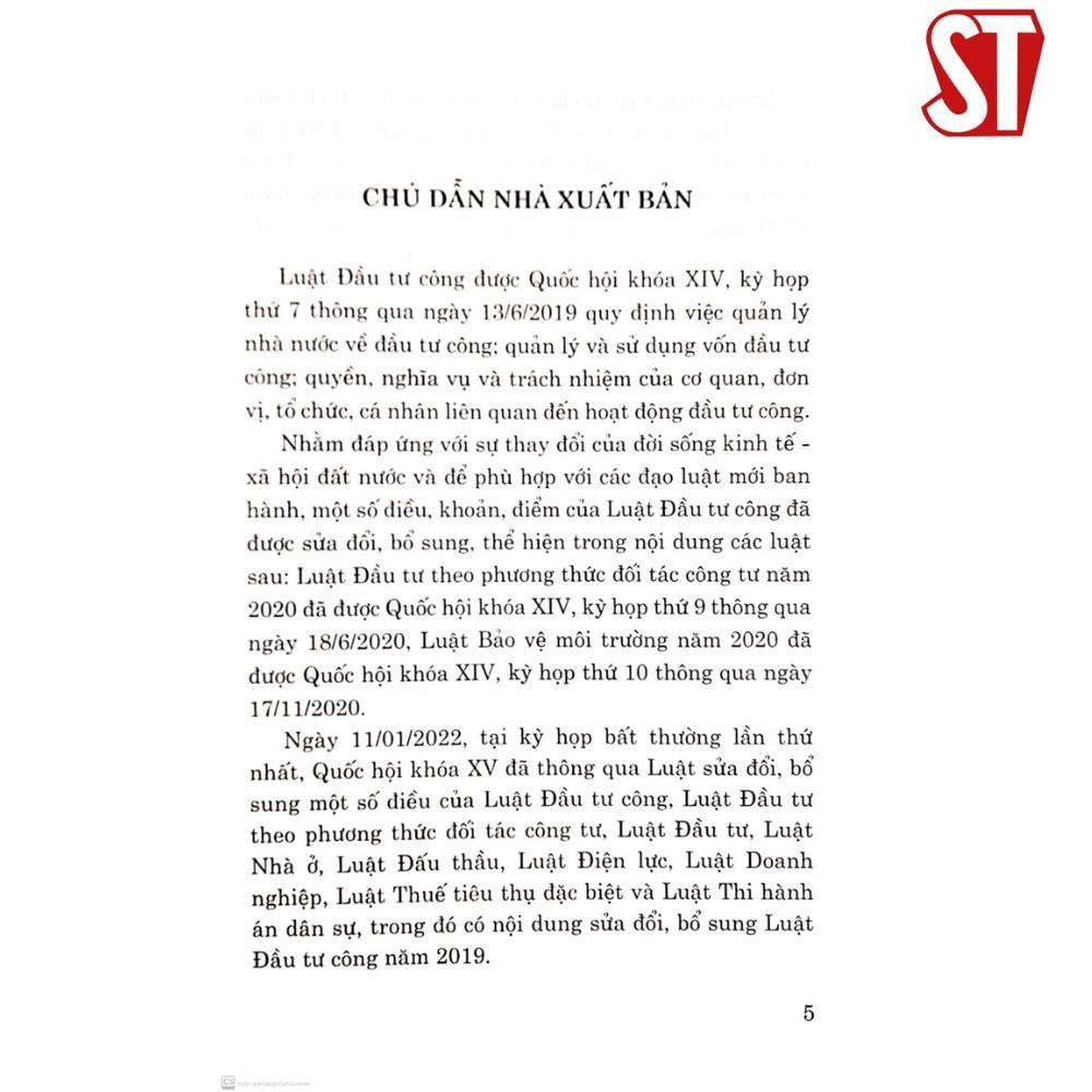 Luật Đầu tư công được Quốc hội khóa XIV, kỳ họp thứ 7 thông qua ngày 13/6/2019. Nhằm đáp ứng với sự thay đổi của đời sống kinh tế – xã hội đất nước và để phù hợp với các đạo luật mới ban hành, một số điều, khoản, điểm của Luật Đầu tư công đã được sửa đổi, bổ sung, thể hiện trong nội dung các luật sau: Luật Đầu tư theo phương thức đối tác công tư năm 2020 đã được Quốc hội khóa XIV, kỳ họp thứ 9 thông qua ngày 18/6/2020, Luật Bảo vệ môi trường năm 2020 đã được Quốc hội khóa XIV, kỳ họp thứ 10 thông qua ngày 17/11/2020. Ngày 11/01/2022, tại kỳ họp bất thường lần thứ nhất, Quốc hội khóa XV đã thông qua Luật sửa đổi, bổ sung một số điều của luật Đầu tư công, Luật Đầu tư theo phương thức đối tác công tư, Luật Đầu tư, Luật Nhà ở…. Cuốn Luật Đầu tư công (hiện hành)(sửa đổi, bổ sung năm 2020, 2022) là văn bản được hợp nhất từ bốn văn bản nêu trên.