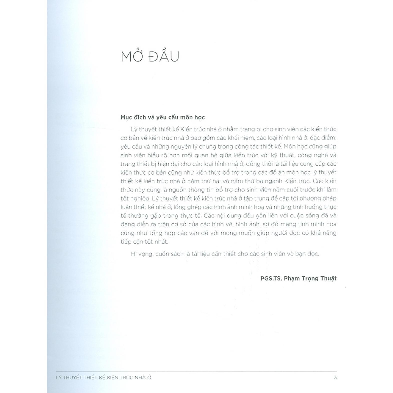 ý thuyết thiết kế Kiến trúc nhà ở nhằm trang bị cho sinh viên các kiến thức cơ bản về kiến trúc nhà ở bao gồm các khái niệm, các loại hình nhà ở, đặc điểm, yêu cầu và những nguyên lý chung trong công tác thiết kế. Môn học cũng giúp sinh viên hiểu rõ hơn mối quan hệ giữa kiến trúc với kỹ thuật, công nghệ và trang thiết bị hiện đại cho các loại hình nhà ở, đồng thời là tài liệu cung cấp các kiến thức cơ bản cũng như kiến thức bổ trợ trong các đồ án môn học lý thuyết thiết kế kiến trúc nhà ở năm thứ hai và năm thứ ba ngành Kiến trúc. Các kiến thức này cũng là nguồn thông tin bổ trợ cho sinh viên năm cuối trước khi làm tốt nghiệp. Lý thuyết thiết kế kiến trúc nhà ở tập trung đề cập tới phương pháp luận thiết kế nhà ở, lồng ghép các hình ảnh minh hoạ và những tình huống thực tế thường gặp trong thực tế. Các nội dung đều gắn liền với cuộc sống đã và đang diễn ra trên cơ sở của các hình vẽ, hình ảnh, sơ đồ mang tính minh hoạ cũng như tổng hợp các vấn đề với mong muốn giúp người đọc có khả năng tiếp cận tốt nhất.