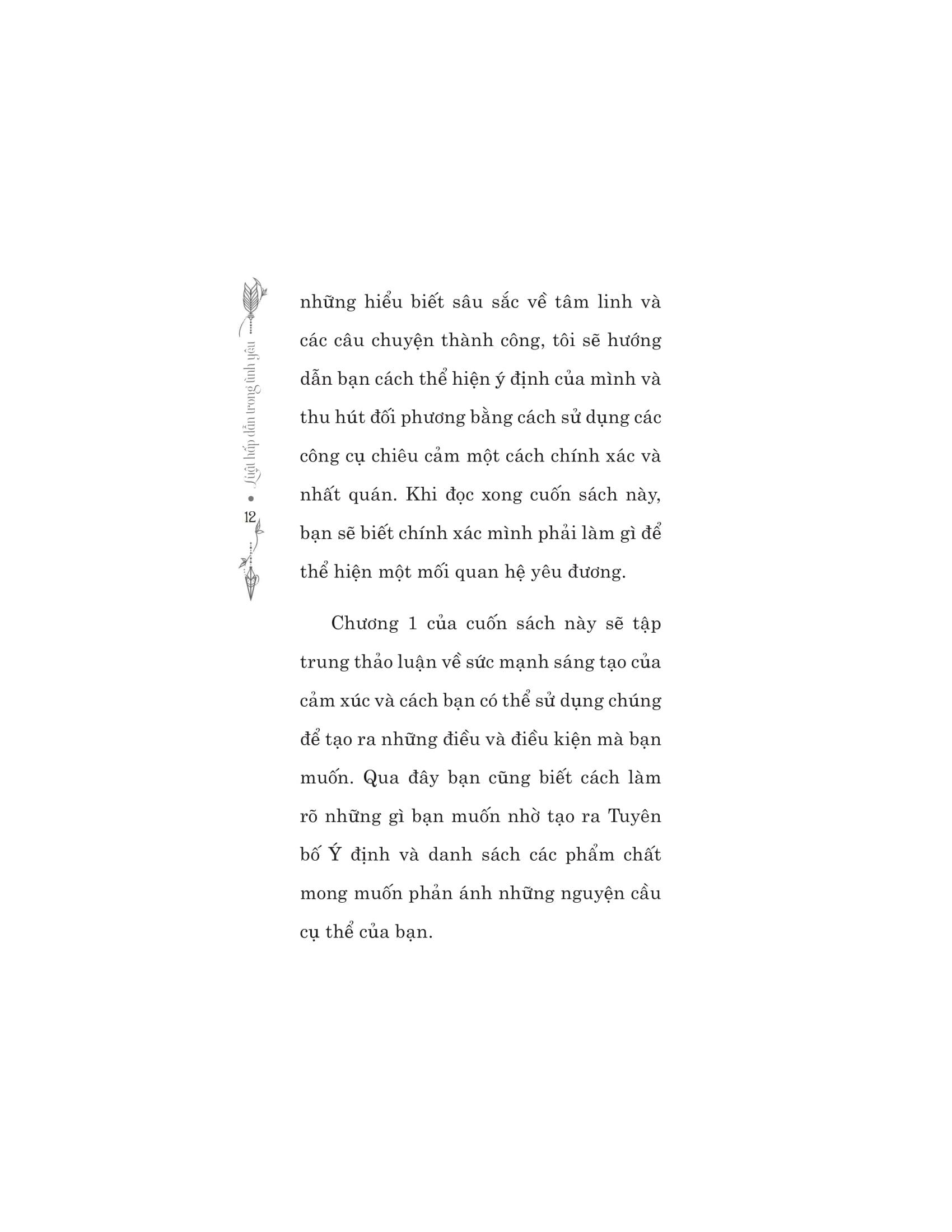 Manifest Tình Yêu Là chủ đề được bàn tán bởi đông đảo người dùng trên các trang mạng xã hội, luật hấp dẫn (Law of Attraction) - một triết lý cho rằng những suy nghĩ tích cực mang năng lượng tích cực sẽ giúp thu hút những kết quả tích cực - được phân tích và ứng dụng trong nhiều lĩnh vực, kể cả tình yêu. Hàm chứa các phương pháp thực hành cùng những câu chuyện thành công đã được kiểm chứng, Manifest Tình Yêu giúp bạn khai thác sức mạnh của cảm xúc và lời nói, hướng dẫn cụ thể về cách bày tỏ ý định rõ ràng, đưa ra lời khẳng định tích cực và vận dụng các công cụ một cách nhặt quán để "manifest" thành công một mối quan hệ nghiêm túc và dài lâu. Cuốn sách ManifestTình Yêu gồm 5 chương với từng nội dung sau: Chương 1: Những đặc điểm lý tưởng mong muốn ở người bạn đời Chương 2: 222 lời khẳng định và cách sử dụng chúng hiệu quả Chương 3: Ba kịch bản trực quan hoá cảm xúc để thu hút tình yêu và sự lãng mạn Chương 4: Q&A về tình yêu Chương 5: Sử dụng luật hấp dẫn để thu hút người bạn đời của bạn. Cuốn sách đã giúp rất nhiều người tìm được người bạn đời lý tưởng của m.ình. Hãy để nó giúp bạn trong hành trình tìm kiếm một nửa hoàn hảo của m.ình. Nếu bạn muốn những ước nguyện về tình yêu đích thực và lâu dài của m.ình trở thành hiện thực hãy biến cuốn sách này thành một trợ thủ đắc lực. Về tác giả Caterina Yolaine là một tác giả chuyên viết về lĩnh vực phát triển bản thân và tâm linh, đặc biệt nổi tiếng với những tác phẩm liên quan đến Luật Hấp Dẫn (Law of Attraction). Bà đã dành hơn 30 năm để chia sẻ kiến thức siêu hình về Luật Hấp Dẫn thông qua các cuốn sách, video và tài liệu thu âm. Một trong những tác phẩm nổi bật của bà là Manifest Your Millions, được đánh giá là một trong những cuốn sách bán chạy nhất về chủ đề này. Tại Việt Nam, cuốn sách Luật Hấp Dẫn Trong Tình Yêu của Caterina Yolaine đã được dịch và xuất bản bởi NXB Thanh Niên vào năm 2023, với sự hợp tác của 1980 Books và dịch giả Phí Mai. Cuốn sách cung cấp những phương pháp thực hành và hiểu biết sâu sắc về tâm linh, giúp người đọc áp dụng Luật Hấp Dẫn để thu hút tình yêu đích thực.
