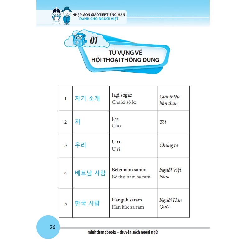 Sách được xây dựng từ cơ bản dành cho những người chưa từng học qua tiếng Hàn đều có thể học được. Cuốn sách được chia thành 2 phần tối ưu cho người tự học: Phần 1 - Hướng dẫn phát âm tiếng Hàn Nguyên âm, phụ âm, phụ âm cuối, quy tắc viết chữ, quy tắc phát âm. Đây là những bài học cơ bản nhất và được trình bày rất rõ ràng, dễ hiểu. Phần 2 - Luyện nghe nói Hướng dẫn từng mẫu câu và từ vựng cơ bản cho các chủ đề gần gũi trong cuộc sống như chào hỏi, phương hướng, giá cả, thời gian, ngày tháng, thời tiết, nhà hàng, mua sắm... Phiên âm Với phần phiên âm, sách đưa ra cả âm chuẩn lẫn âm bồi tiếng Việt để người tự học dễ dàng tiếp thu và thực hành theo. Cuốn sách không áp đặt cách học vẹt khi luôn đưa ra đầy đủ lý do cho ngữ pháp hay cách phát âm, ví dụ như cùng một âm tiết nhưng cách phát âm sẽ khác nhau do có phụ âm cuối khác nhau. Cuốn sách còn có sự hỗ trợ đắc lực từ đĩa CD do các giáo viên Hàn Quốc thể hiện, giúp bạn học cách phiên âm, giọng điệu đúng chuẩn.