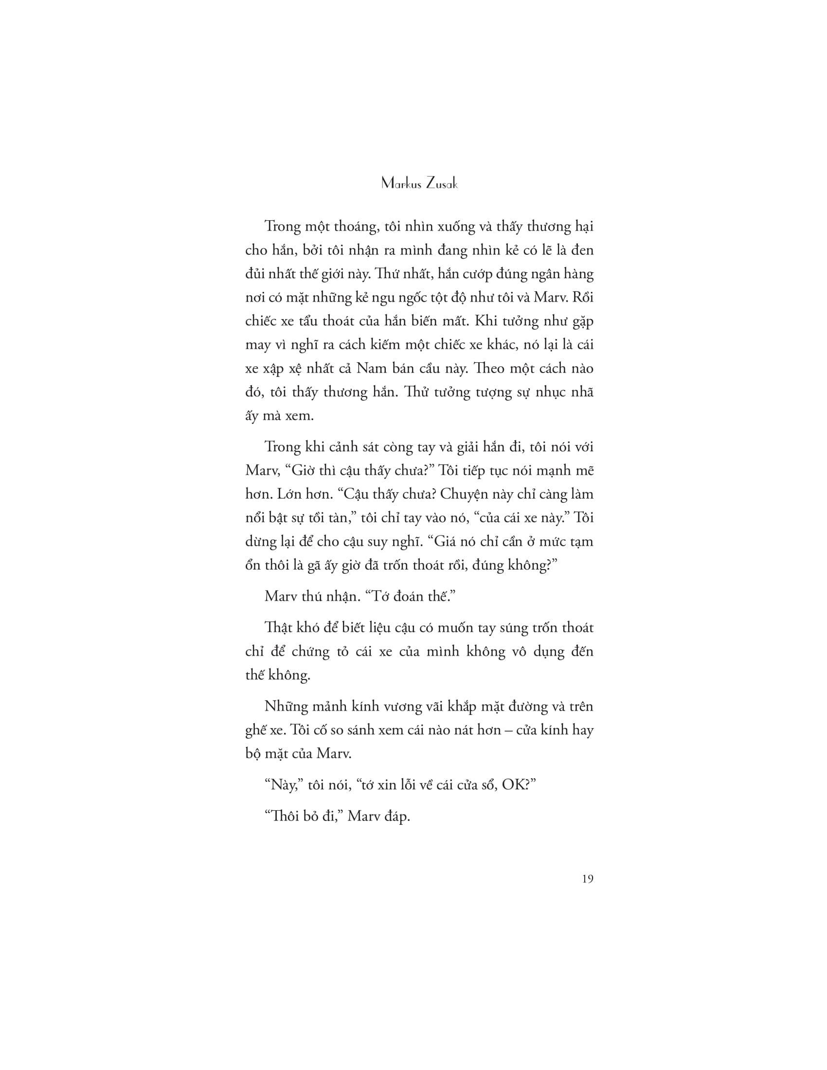 Markus Frank Zusak là một nhà văn người Úc gốc Áo và Đức. Ông nổi tiếng với hai tác phẩm “Kẻ trộm sách” và “Người đưa tin bí ẩn”. Hai cuốn tiểu thuyết này đều là những tác phẩm dành cho thanh thiếu niên xuất sắc, được độc giả khắp thế giới đón nhận. Ông đã giành giải thưởng Margaret A. Edwards năm 2014 vì những đóng góp bền bỉ cho văn học.