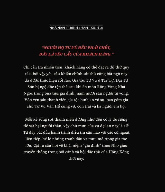 Chỉ cần trả nhiều tiền, khách hàng có thể đặt ra đủ thứ quy tắc, bởi vậy yêu cầu khiến chính sát thủ cũng bất ngờ này đã được thực hiện rốt ráo. Gia tộc Tư Vũ ở Tây Tự, Đại Tự Sơn bị ngộ độc tập thể sau khi ăn món Rồng Vàng Nhà Ngọc trong bữa tiệc gia đình, năm mươi sáu người tử vong. Vỏn vẹn sáu thành viên gia tộc bình an vô sự, bao gồm gia chủ Tư Vũ Văn Hồ cùng vợ, con trai và ba người em họ.