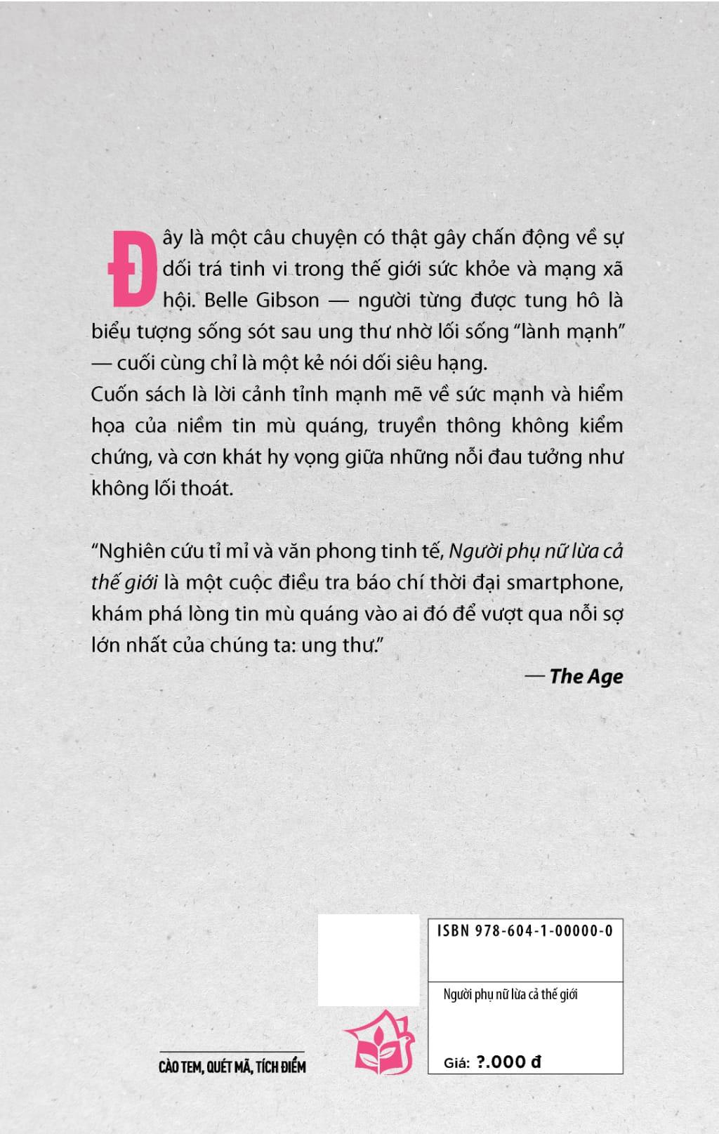 NGƯỜI PHỤ NỮ LỪA CẢ THẾ GIỚI (The Woman Who Fooled the World: Belle Gibson’s Cancer Con, and the Darkness at the Heart of the Wellness Industry) do hai nhà báo Beau Donelly và Nick Toscano viết, là một tác phẩm phi hư cấu xuất sắc phản ánh sự lừa đảo tinh vi trong thế giới sức khỏe và truyền thông.
