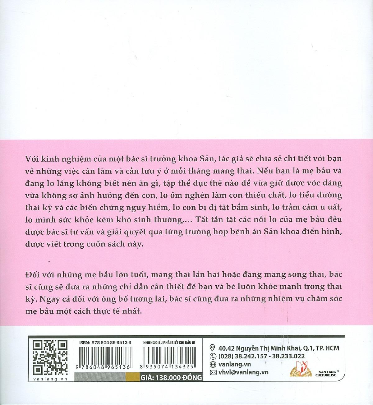 Với kinh nghiệm của một bác sĩ trưởng khoa Sản, tác giả sẽ chia sẻ chi tiết với bạn về những việc cần làm và cần lưu ý ở mỗi tháng mang thai. Nếu bạn là mẹ bầu và đang lo lắng không biết nên ăn gì, tập thể dục thế nào để vừa giữ được vóc dáng vừa không sợ ảnh hưởng đến con, lo ốm nghén làm con thiếu chất, lo tiểu đường thai kỳ và các biến chứng nguy hiểm, lo con bị dị tật bẩm sinh, lo trầm cảm u uất, lo m.ình sức khỏe kém khó sinh thường,… Tất tần tật các nỗi lo của mẹ bầu đều được bác sĩ tư vấn và giải quyết qua từng trường hợp bệnh án Sản khoa điển hình, được viết trong cuốn sách này.