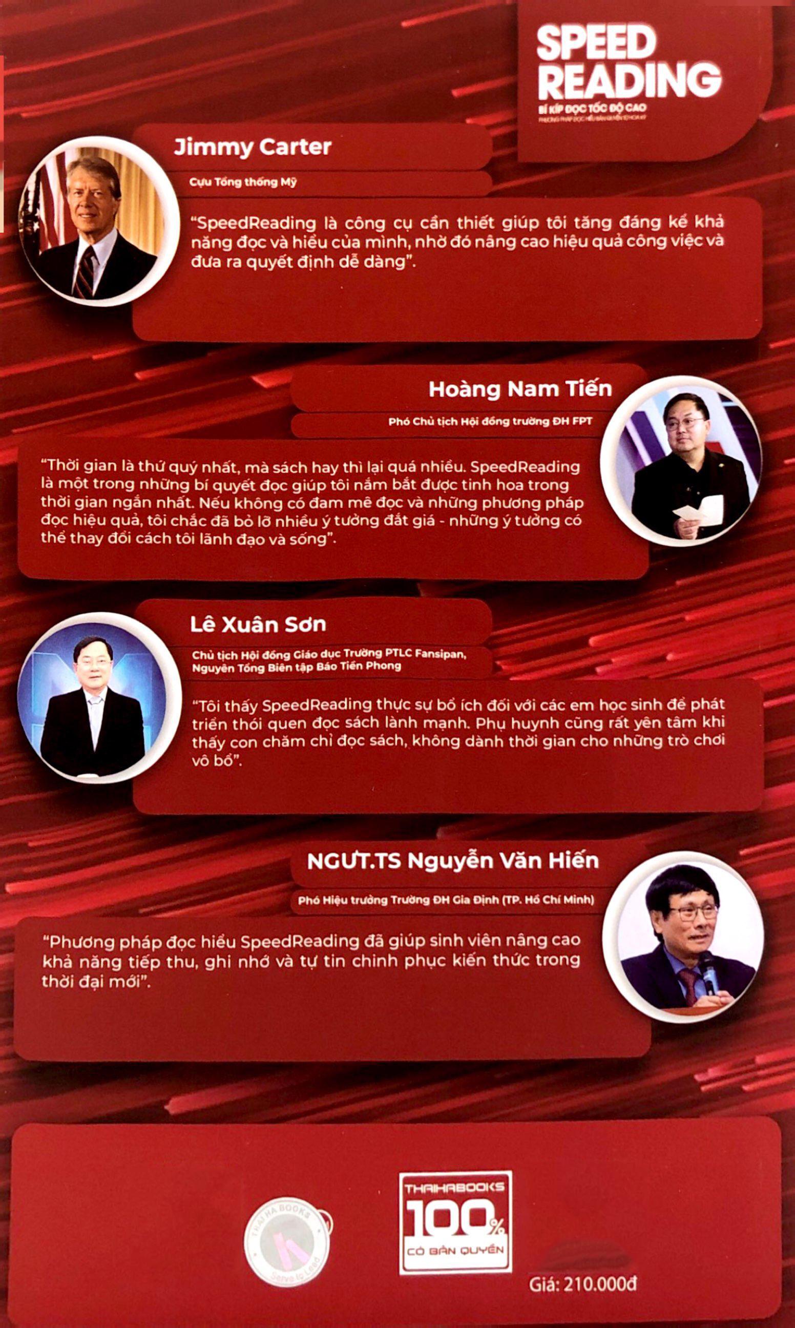 Speedreading - Bí Kíp Đọc Hiểu Tốc Độ Cao Bạn có bao giờ thấy m.ình chạy deadline trong khi vẫn chưa... đọc xong đống tài liệu? Chúng ta đang sống trong thời đại của tốc độ! Mọi thứ đều nhanh hơn, từ xe cộ, mạng internet đến cả nhịp sống hằng ngày. Trong khi đó, lượng thông tin thì cứ thế “bùng nổ” mỗi giây mỗi phút, khiến chúng ta lúc nào cũng phải vật lộn với đống tin tức, , báo cáo, sách vở. Và nếu bạn là một trong những người vẫn còn lề mề từng dòng từng chữ, thì xin chúc mừng, bạn đang tham gia giải đấu “chậm mà chắc... bỏ lỡ cơ hội”! Đây là lý do kỹ năng đọc hiểu nhanh – hay còn gọi là Speed Reading – không chỉ là một lựa chọn mà còn là một “v.ũ khí bí mật” để bạn không bị tụt lại. Đọc nhanh sẽ giúp bạn nắm bắt thông tin kịp thời, xử lý công việc hiệu quả và đặc biệt, nó giống như việc cài thêm “phần mềm tăng tốc” cho bộ não vậy! Bạn sẽ thấy mọi thứ trong cuộc sống của m.ình dần trở nên trôi chảy hơn, suôn sẻ hơn vì bạn có khả năng giải quyết thông tin nhanh gọn, chuẩn xác. Phương pháp Speedreading có từ những năm 1920, nhưng manh nha từ năm 1878 khi bác sĩ nhãn khoa Louis Emile Javal quan sát chuyển động của mắt trong khi đọc. Sau đó là phát minh kỹ năng “dò chữ bằng tay” của giáo viên Evelyn Wood. Kể từ đó, đọc nhanh ngày càng được quan tâm, những người nổi tiếng quan tâm đến có thể kể tới tổng thống John Kennedy, Jimmy Carter… Cuốn sách Speedreading là hướng dẫn chi tiết để bạn từ một người đọc thông thường trở thành “tay đua” tốc độ trong thế giới sách vở. Cuốn sách Speedreading sẽ giúp bạn nhận diện và loại bỏ các chướng ngại đang cản bước bạn đọc nhanh hơn. Bạn sẽ học được những kỹ thuật đã được kiểm nghiệm và áp dụng từ chính những người thành công, và chỉ cần kiên trì, kỹ năng này sẽ đưa bạn tới những thành quả mà bạn chưa từng nghĩ m.ình có thể đạt được. Hãy tạm biệt những thói quen cũ kỹ như đọc thầm, cố định mắt, hay đọc lại, và chuẩn bị cho sự chuyển m.ình ngoạn mục. Với SpeedReading, bạn sẽ không chỉ đọc nhanh hơn mà còn phá bỏ mọi rào cản ngăn bạn chinh phục tri thức!
