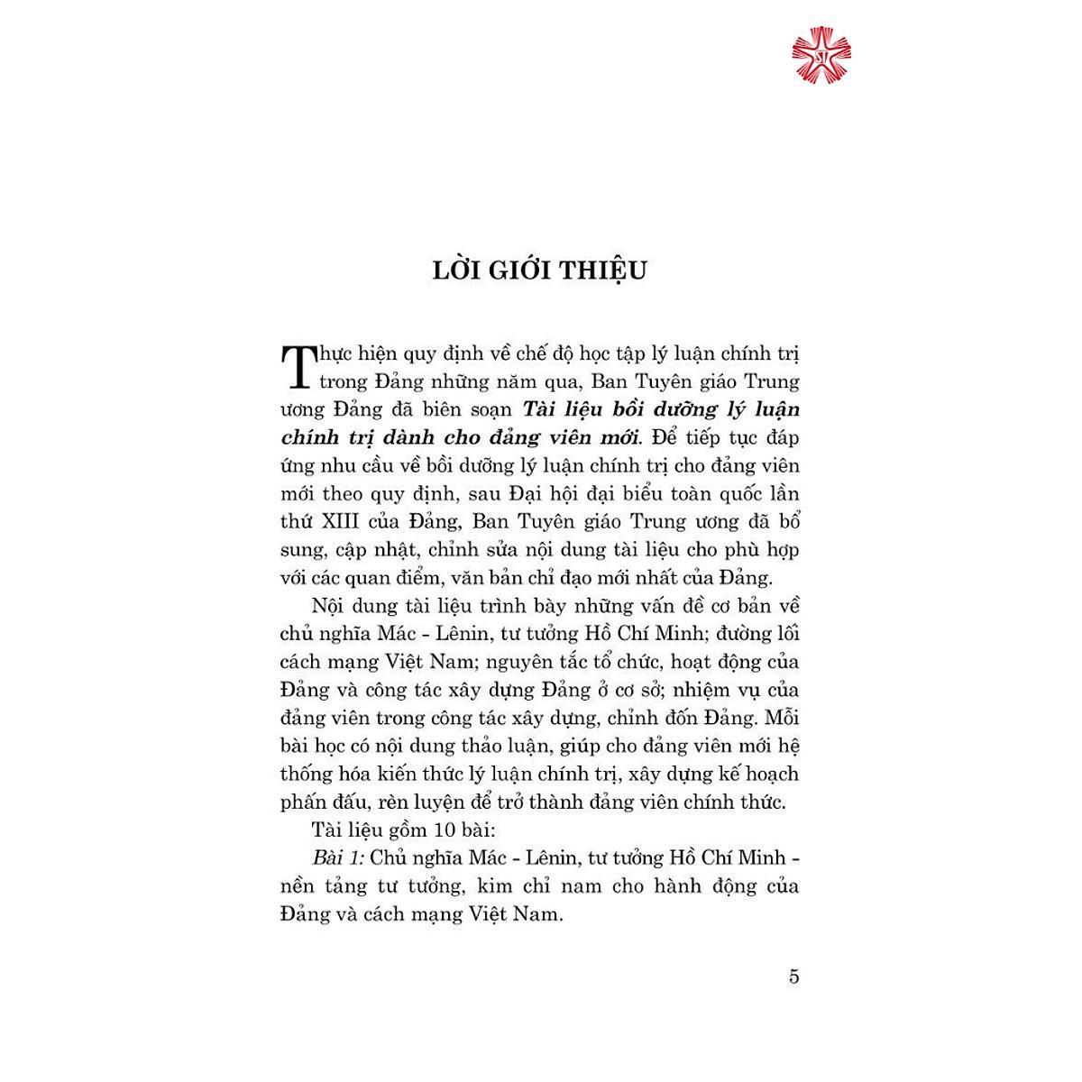 Thực hiện quy định về chế độ học tập lý luận chính trị trong Đảng những năm qua. Ban Tuyên giáo Trung ương Đảng đã biên soạnTài liệu bồi dưỡng lý luận chính trị dành cho đảng viên mới. Để tiếp tục đáp ứng nhu cầu về bồi dường lý luận chính trị cho đảng viên mới theo quy định, sau Đại hội đại biểu toàn quốc lần thứ XIII của Đảng, Ban Tuyên giáo Trung ương đã bổ sung, cập nhật, chỉnh sửa nội dung tài liệu cho phù hợp với các quan điểm, văn bản chỉ đạo mới nhất của Đảng. Nội dung tài liệu trình bày những vấn đề cơ bản về chủ nghĩa Mác - Lênin, tư tương Hồ Chí Minh; đường lối cách mạng Việt Nam; nguyên tắc tổ chức, hoạt động của Đàng và công tác xây dựng Đảng ở cơ sở; nhiệm vụ của đảng viên trong công tác xây dựng, chỉnh đốn Đảng. Mỗi bài học có nội dung thào luận, giúp cho đàng viên mới hệ thống hóa kiến thức lý luận chính trị, xây dựng kế hoạch phấn đấu, rèn luyện để trở thành đảng viên chính thức.