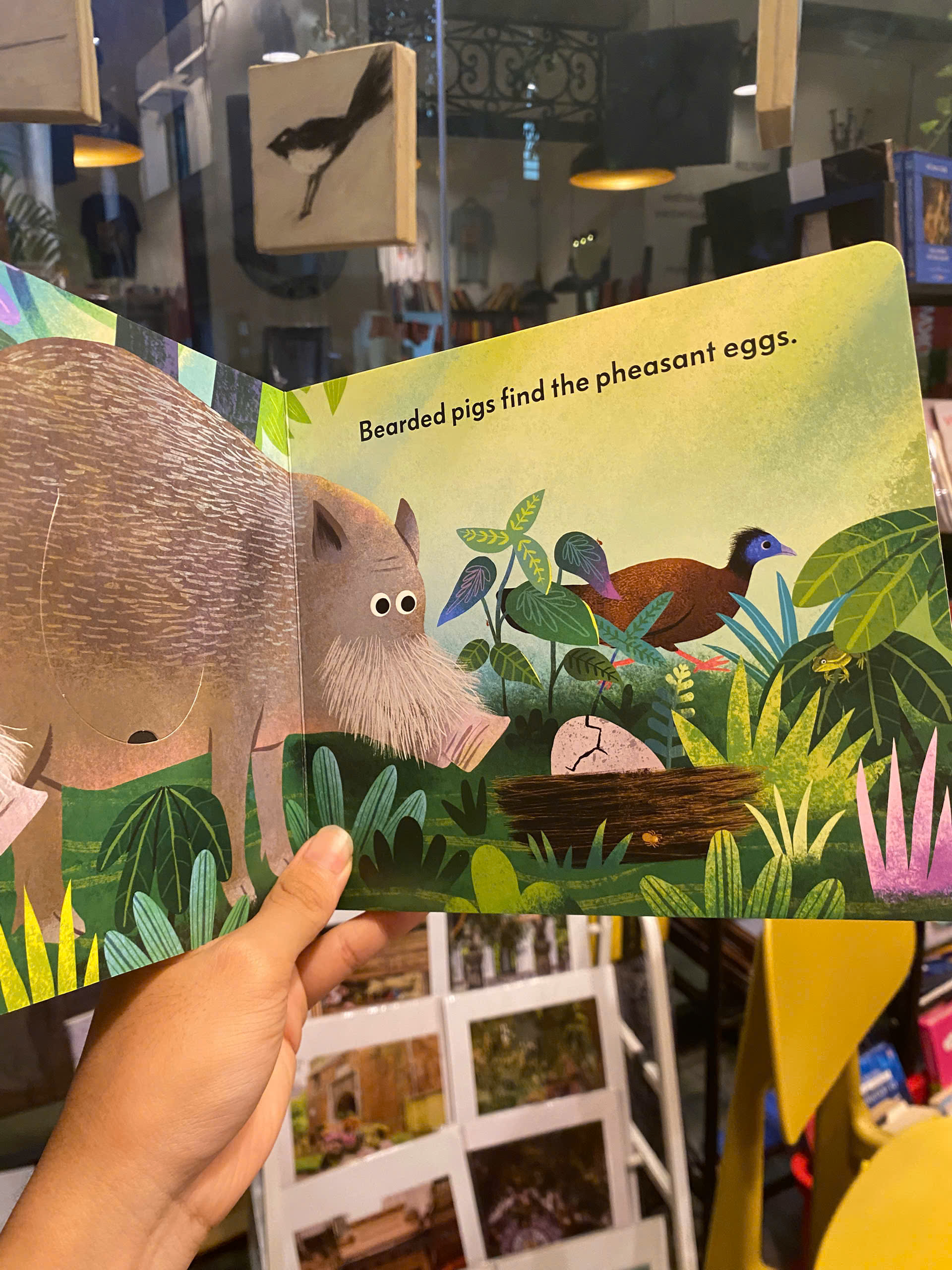 Chào mừng đến với khu rừng rậm! Hãy cùng quan sát một số loài động vật ở đó và khám phá cách chúng phụ thuộc lẫn nhau. Bọ cánh cứng gặm lá cây, nhện thì vồ lấy chúng. Ếch rình rập nhện, và một chú gà lôi Argus chờ ếch nhảy. Và cứ thế, câu chuyện tiếp diễn, với một vài chú lợn râu và một chú trăn không quá đáng sợ. Nhưng bạn nghĩ loài vật lớn nhất trong số chúng sẽ ăn gì? Với hình ảnh minh họa đậm nét và thân thiện, nội dung đơn giản và những trang sách tương tác thú vị, Michael Slack đưa độc giả nhỏ tuổi đi từ đầu đến cuối chuỗi thức ăn và ngược lại để khám phá những điều bất ngờ thú vị.