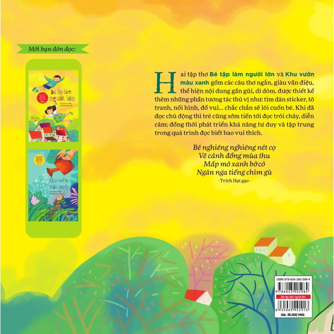 Những câu thơ ngắn, ngôn từ gần gũi, giọng thơ ngộ nghĩnh giúp trẻ dễ đọc, dễ nhớ. Bên cạnh đó, các bức minh họa sinh động với gam màu tươi tắn cũng tạo cơ hội cho trẻ làm quen với các mảng màu sắc, trí tưởng tượng của trẻ phát triển. Hoạt động đọc cần diễn ra với cảm xúc tò mò, hứng khỏi, nhờ đó các bé nhớ từ nhanh hơn, mở rộng vốn từ tốt hơn. Hai tập thơ “Khu vườn màu xanh” và “Bé tập làm người lớn” gồm các câu thơ ngắn, giàu vần điệu, thể hiện nội dung gần gũi, dí dỏm, lại được thiết kế những phần tương tác thú vị như: tìm dán sticker, tô tranh, nối hình, đố vui… chắc chắn sẽ lôi cuốn bé. Một khi đã đọc chủ động thì trẻ cũng sớm tiến tới đọc trôi chảy, diễn cảm; đồng thời phát triển khả năng tư duy và tập trung trong quá trình đọc biết bao vui thích.
