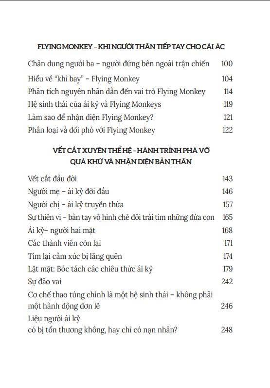 Từ đó, tác giả dẫn người đọc đi sâu vào cấu trúc của những gia đình ái kỷ, nơi các thành viên sống trong vai diễn được sắp đặt: người kiểm soát, người im lặng, người phản kháng, người bị gán tội. Với từng lát cắt tinh tế và chân thực, sách giúp người đọc nhận diện các hành vi thao túng, gaslighting (đánh tráo nhận thức), sự im lặng đồng lõa (Flying Monkey), và những hệ quả tàn khốc của bạo hành tinh thần xuyên thế hệ.