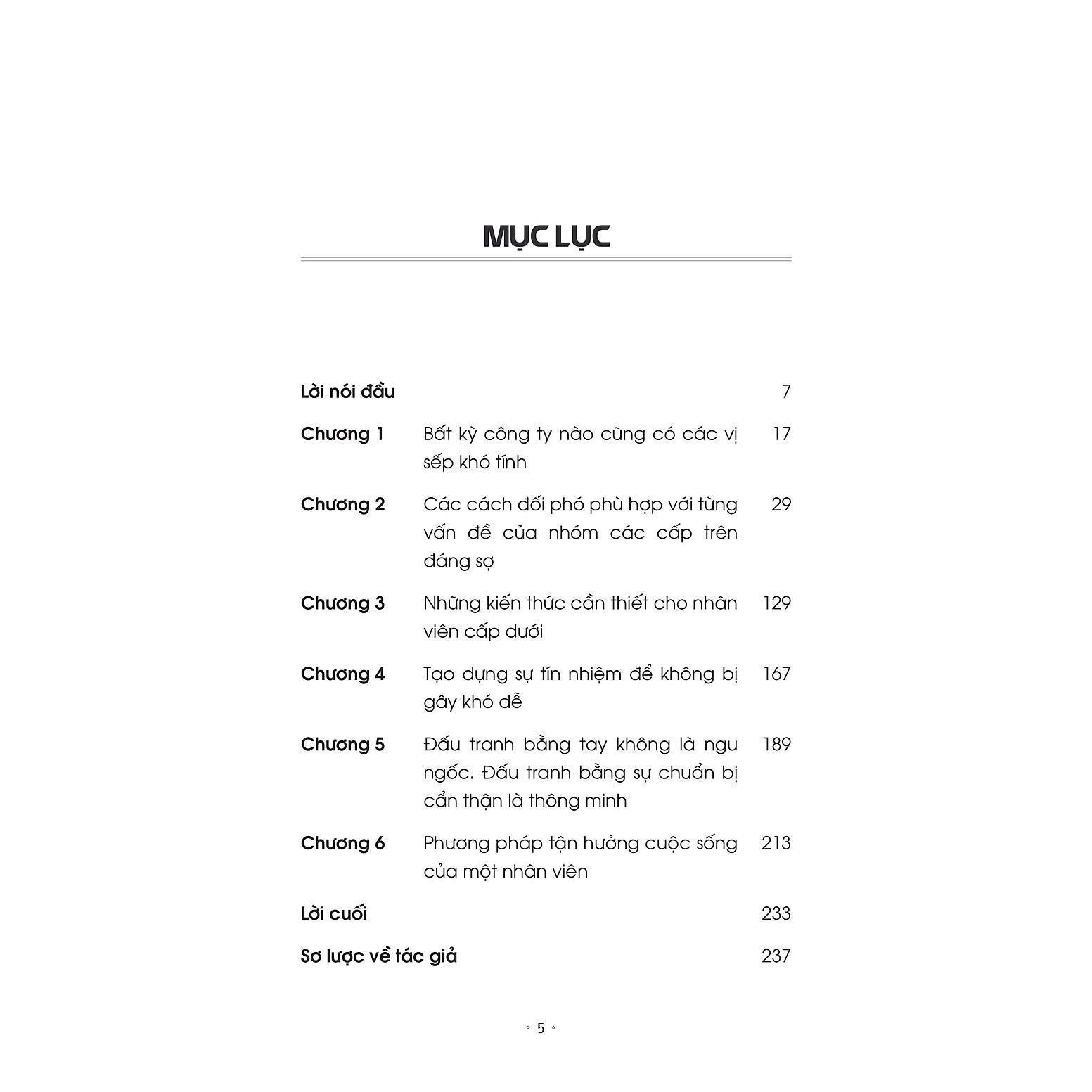 Tác giả cho rằng ở bất kỳ công ty nào cũng có các vị sếp đáng sợ và chia họ thành 3 nhóm: cấp trên khó chịu, cấp trên vô dụng và cấp trên hồ đồ. Tác giả giới thiệu đặc điểm của ba nhóm cấp trên, và với mỗi nhóm tác giả đều đưa ra các tình huống minh họa và các giải pháp để cấp dưới không còn cảm thấy áp lực hay sợ hãi khi làm việc với các cấp trên như vậy.