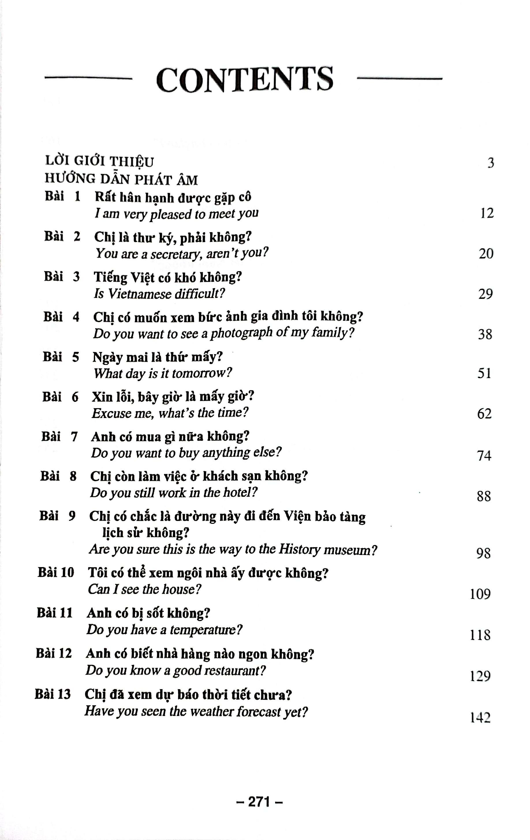 Trong cuốn sách này, người học sẽ được hướng dẫn chi tiết từ cách phát âm, cách viết mẫu tự tiếng Việt, các điểm chính yếu của văn phạm tiếng Việt, đàm thoại, từ ngữ và thành ngữ, văn phạm, thực hành, luyện đọc hiểu. Phần hội thoại là các tình huống thật, giúp người học làm quen với lối giao tiếp của người Việt Nam. Cũng giống như tất cả những ngôn ngữ khác, văn viết và văn nói tiếng Việt có một số khác biệt như khi sử dụng từ lóng, thêm lối nói trang trọng trong những tình huống đặc biệt.