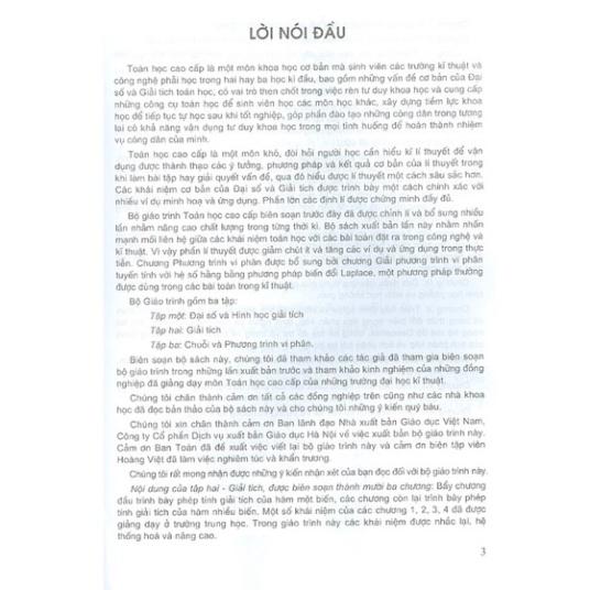 Biên soạn bộ sách này chúng tôi đã tham khảo các tác giả đã tham gia viết bộ giáo trình trong những lần xuất bản trước và tham khảo kinh nghiệm của những đồng nghiệp đã giảng dạy môn Toán học cao cấp của những trường đại học kĩ thuật.