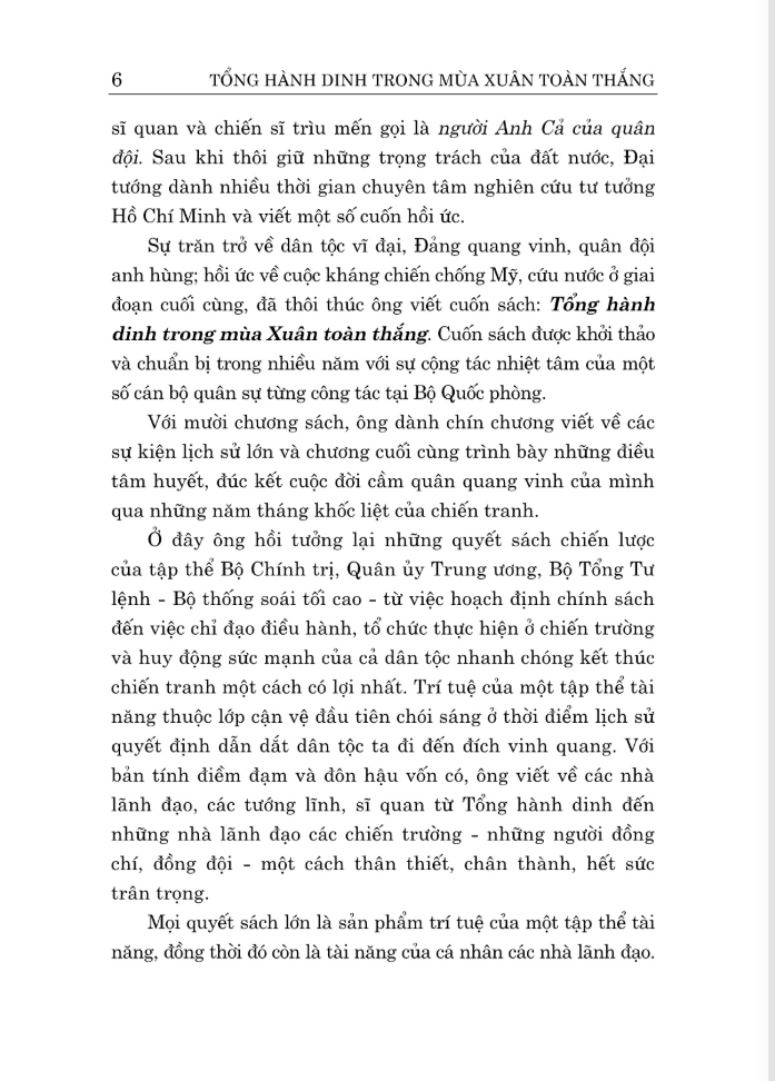 Mua tại TiktokTổng Hành Dinh Trong Mùa Xuân Toàn Thắng - Hồi Ức Cuốn hồi ức Tổng hành dinh trong mùa Xuân toàn thắng gồm 10 chương, trong đó Đại tướng dành chín chương viết về các sự kiện lịch sử lớn của dân tộc và chương cuối cùng trình bày những điều tâm huyết, đúc kết cuộc đời cầm quân quang vinh của m.ình qua những năm tháng khốc liệt của chiến tranh. Cuốn sách giúp độc giả thấy rõ bản lĩnh và trí tuệ Việt Nam ở những thời điểm lịch sử quyết định: nhạy bén, sáng tạo, quyết đoán, nắm bắt thời cơ và nỗ lực cao độ nhằm quét sạch quân thù.