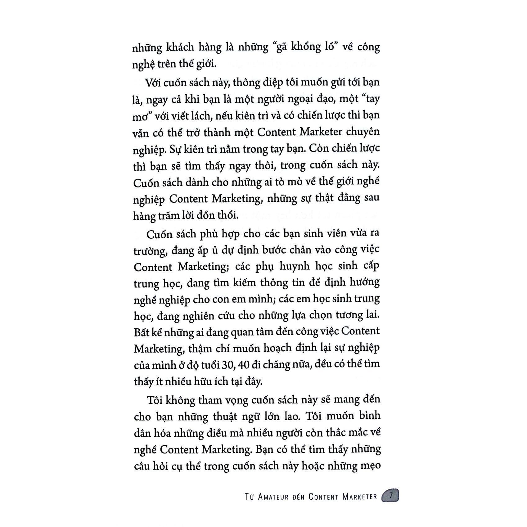 Mua tại TiktokTừ Amateur Đến Content Marketer GIỚI THIỆU SÁCH: Từ Amateur Đến Content Marketerlà cuốn sách lý tưởng cho những ai quan tâm đến ngành Content Marketing, từ những người mới ra trường đến những người muốn chuyển đổi nghề nghiệp. Tác phẩm không chỉ là hướng dẫn cụ thể về những bước cơ bản để thành công trong lĩnh vực này mà còn là một lời khuyên chân thành từ một người đã từng đi từ đẳng cấp "nghiệp dư" đến chuyên gia Content Marketing. Cuốn sách giới thiệu một cách rõ ràng về bản chất và vai trò của Content Marketing, cùng những câu chuyện thực tế sâu sắc về những thử thách và thành công của tác giả trong công việc. Điểm mạnh của cuốn sách là khả năng cung cấp cho độc giả những chiến lược cụ thể để bắt đầu và phát triển sự nghiệp trong ngành. Bên cạnh đó, sách cũng chia sẻ những lời khuyên về việc xây dựng chiến lược cá nhân, phân tích nguồn lực và thực hiện kế hoạch một cách hiệu quả. Dành cho mọi đối tượng từ người mới bắt đầu đến những ai đang cân nhắc sự nghiệp trong Content Marketing,Từ Amateur Đến Content Marketerlà nguồn tư liệu quý giá để khám phá và tiến xa hơn trong lĩnh vực này.