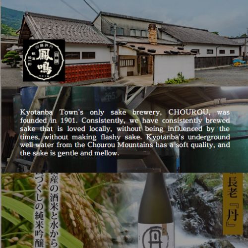 Chorou Tan Junmai Ginjo Với hương vị mịn, nhẹ. Rượu sake `` Chourou Tan '' được làm hoàn toàn từ gạo, nước, nhà máy rượu sake và nhà sản xuất bia của Kyotanba, đồng thời